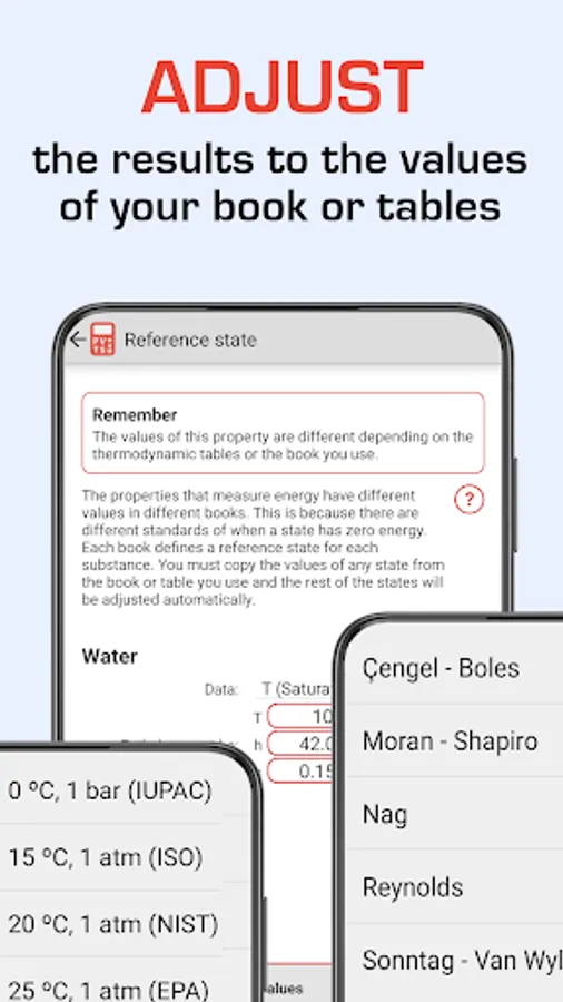- Reference State to adjust the results to different books or bibliographic sources: Cengel - Boles, Moran - Shapiro, Sonntag - Borgnakke - Van Wylen, Rogers - Mayhew, Bejan, Nag, Khurmi, etc.