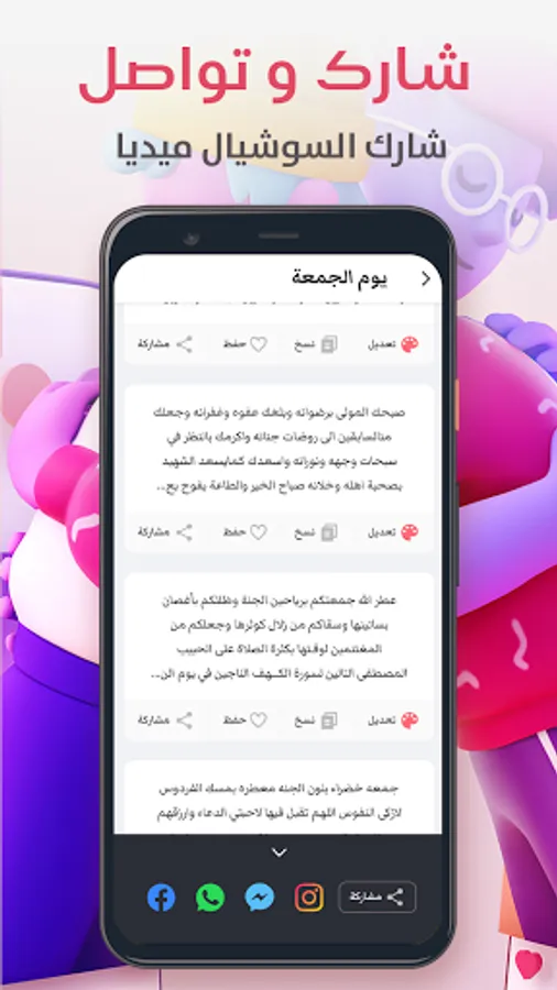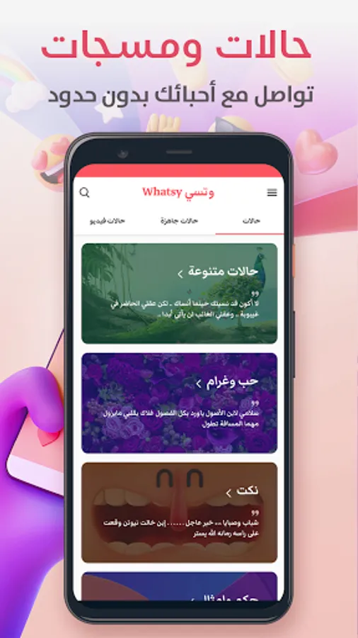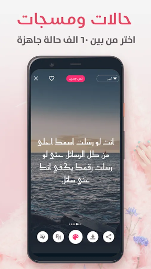 Download the application, choose the message, customize it with your wonderful personality, share it and communicate with your friends and family easily through the application of messages and cases! The application is attractive and easy to use and contains many great options such as saving a message or a status in addition to customizing the message with your personal image and you can choose many cards and greetings, the application contains a very large number of messages.
