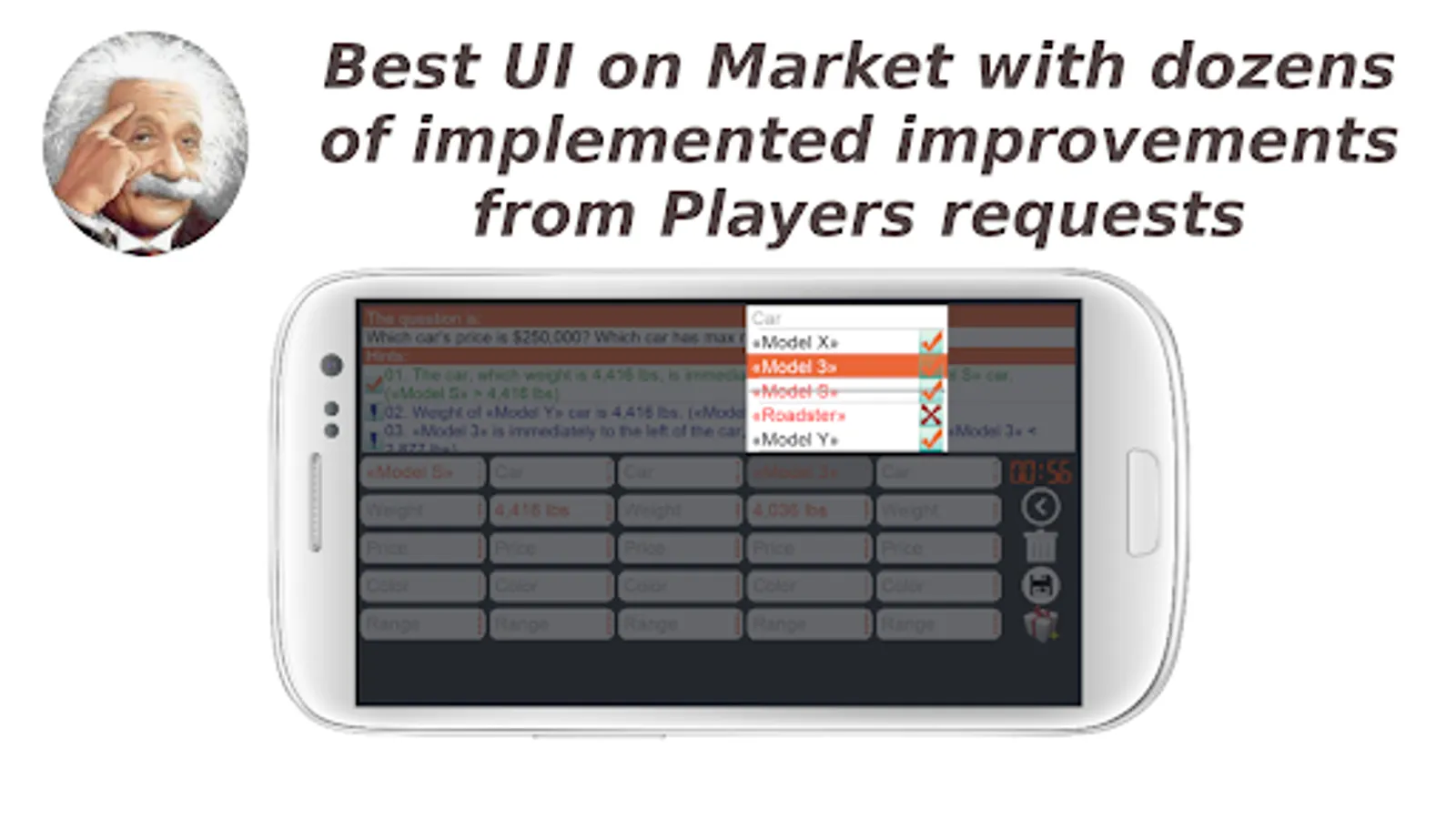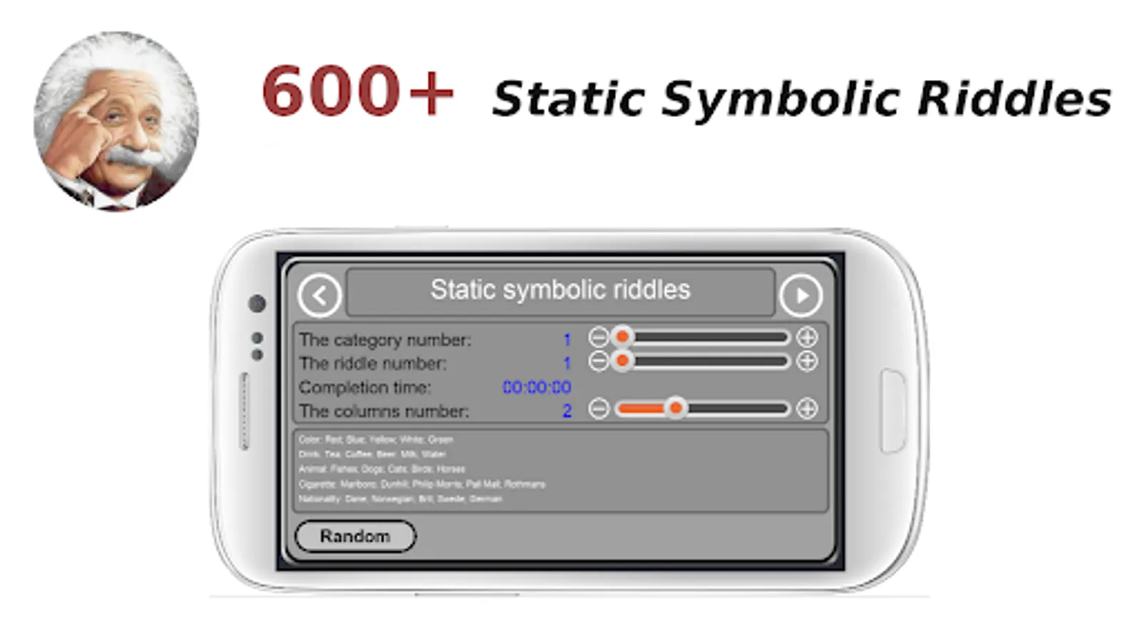 Einstein's Riddle - the logic puzzle, according to legend, created by Albert Einstein during his childhood. It was used by Einstein to test candidates for assistants the ability to think logically.
