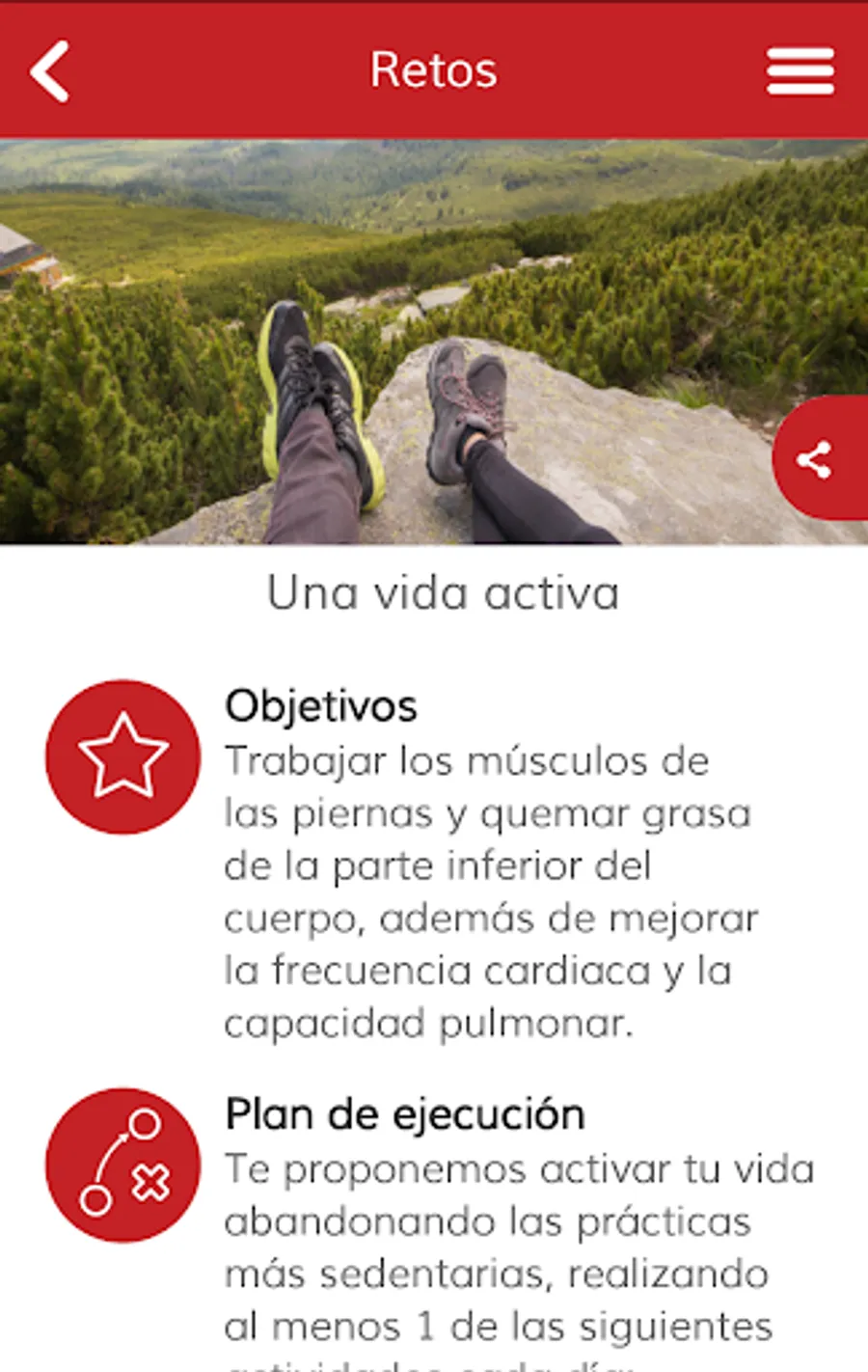 The application brings together different sections: My plan (which collects data from your profile, your health status and progress of your challenges) Survey, Challenges, Recipes, news, social networks, resources interest, thinking about others and Questions Frequently.