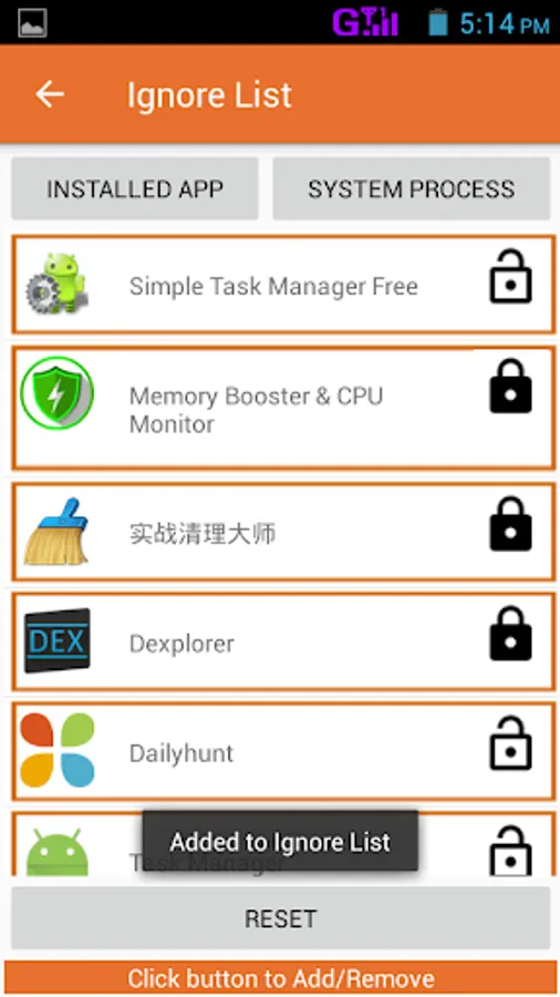 A: Select ignore app and add apps in ignore list . The ignored apps will never be killed. You can manage the ignored apps in settings.