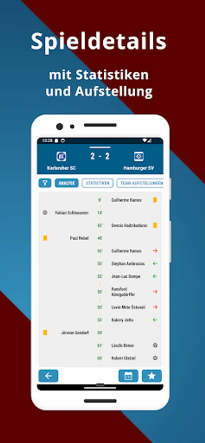 Tap on a match and see all the details about who scored, substitutions, yellow and red cards.