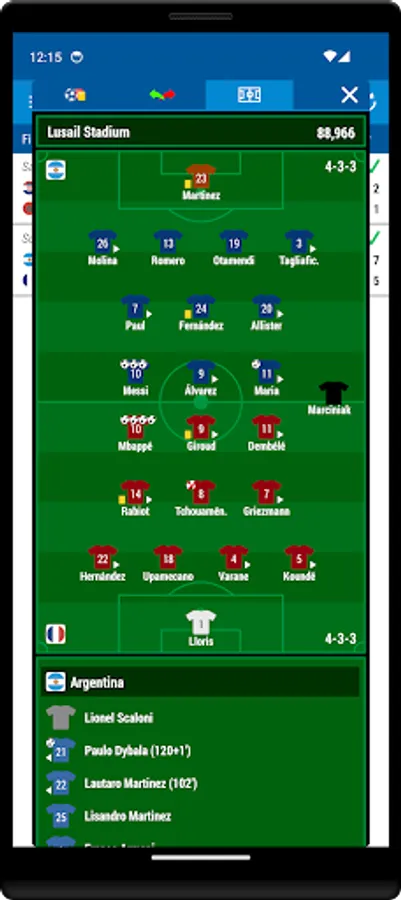 Goals, yellow cards, red cards, substitutions, team line-up, and assist on goal scorer.