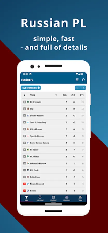When you tap on a team in the standings table, you can find extended standings information. You can also see the latest matches played by the team. There is also a players-button takes you to a screen with the complete team squad. Tap on a player in the list and find even more information about each player.