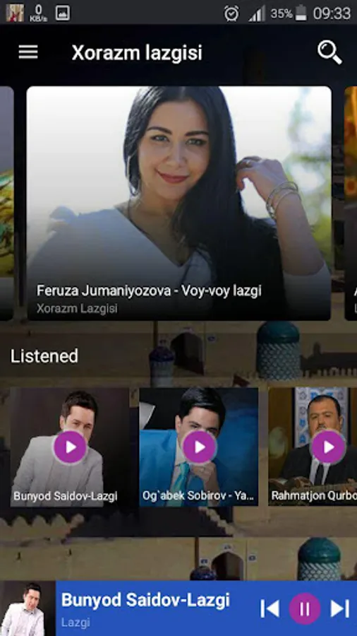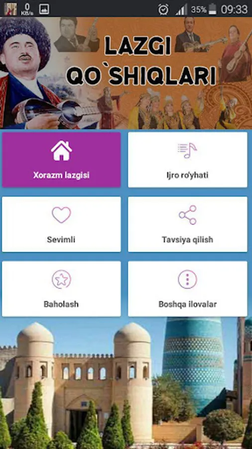 Ushbu ilovada nafaqat Xorazm san`atiga balki butun O`zbek san`atini duyyoga tanitgan mashhur sanatkorlar tomonidan ijro etilgan "Lazgi" qo`shiqlari jamlangan.