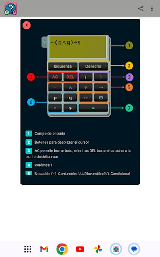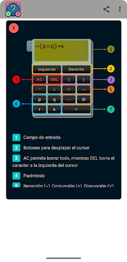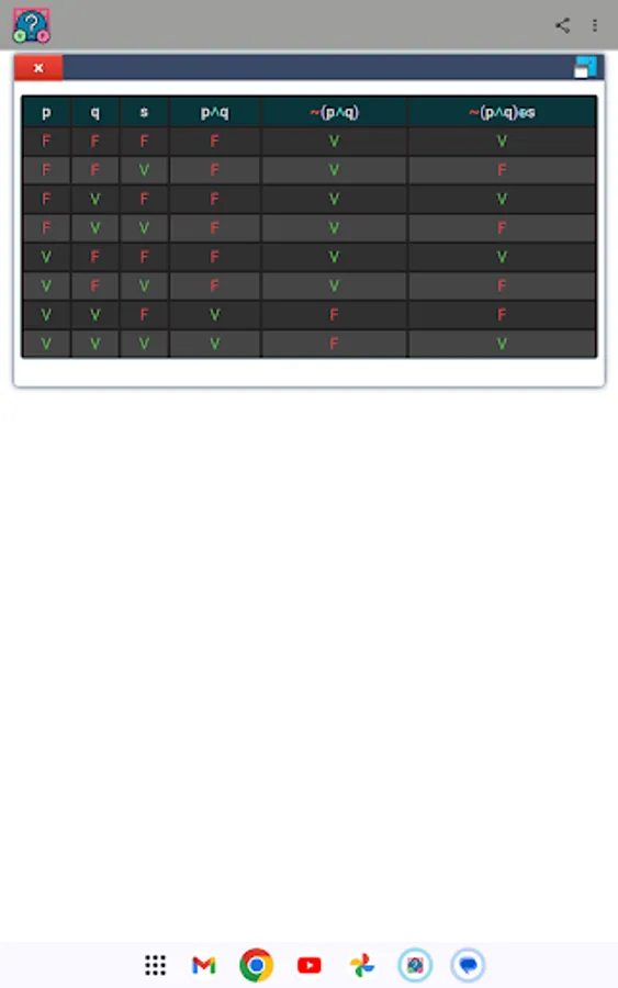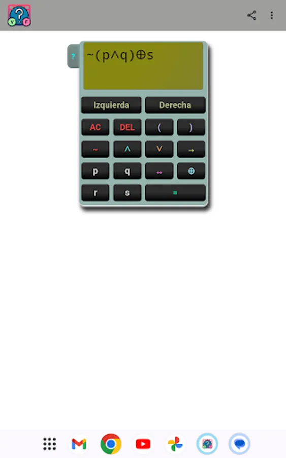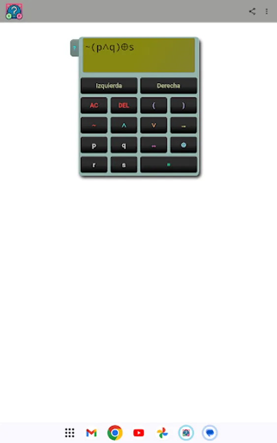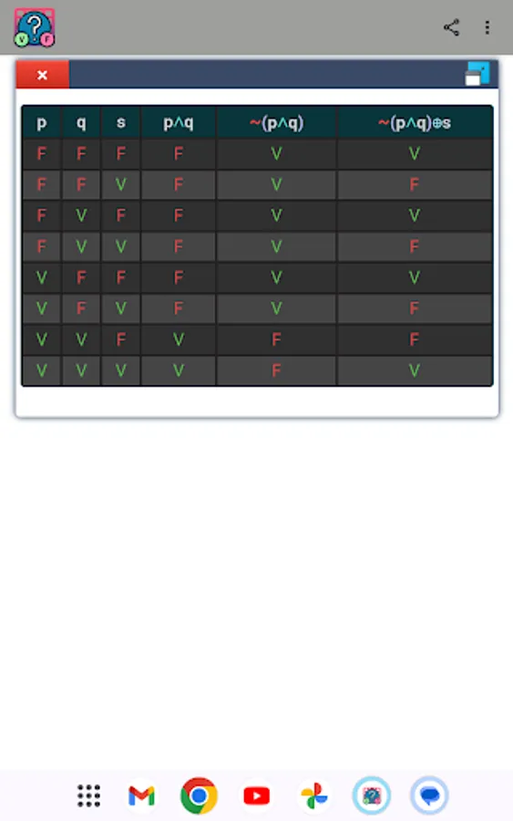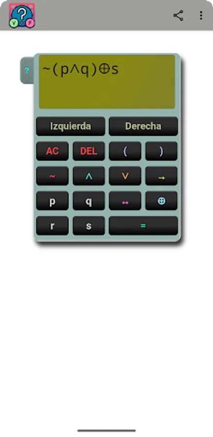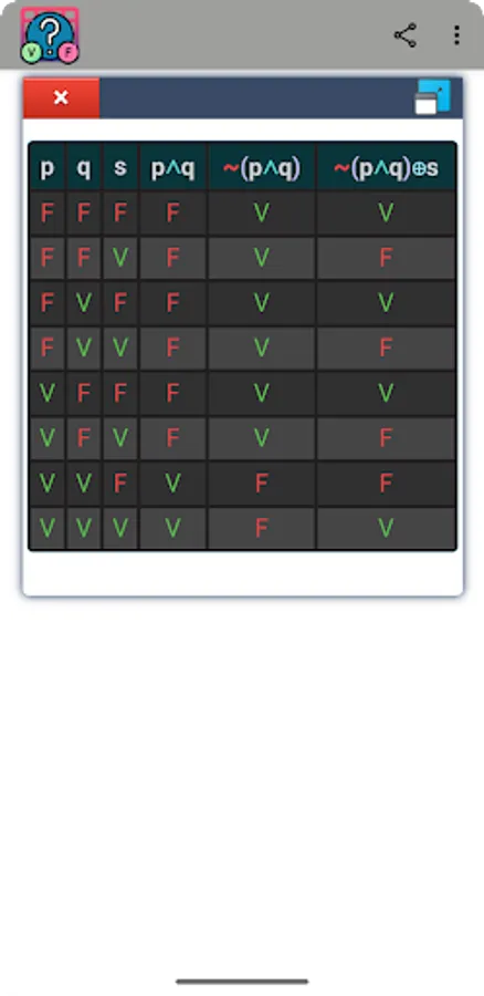 🌟 Simple and intuitive interface: A simple and easy-to-use application, perfect for students and professionals who work with logic. Using the truth table generator is quite simple and intuitive, thanks to the virtual keyboard it has. To use it you will only have to enter the logical statement in the generator and press the "=" button on the keyboard to obtain the resulting table. To construct your sentences you have the following propositions on the keyboard: p, q, r, s. But you can use as many variables as you need using your device's keyboard.
