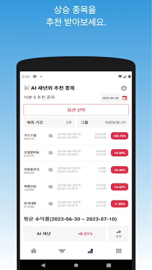 AI Shannon selects and recommends rising stocks. Options can be selected by period (long/short term) or by sector to provide information appropriate to the user's propensity or preference.