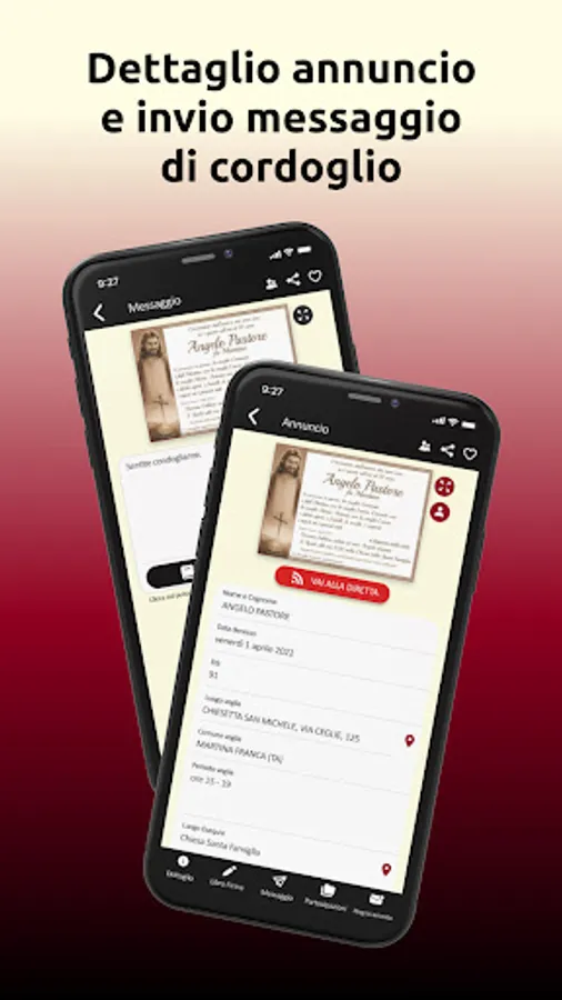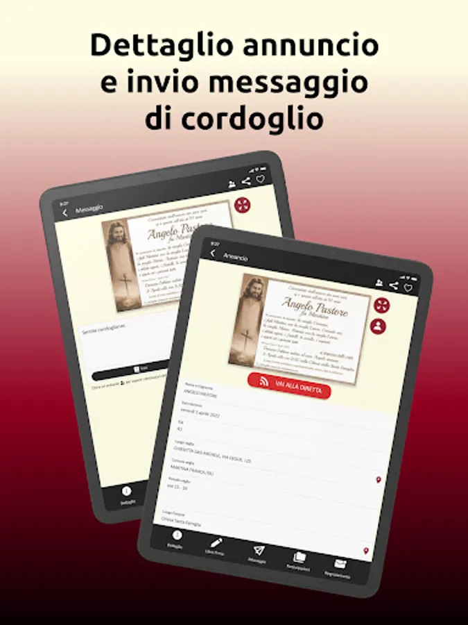 It is no longer necessary to consult the funeral posters posted on the streets, with our app it is quick and easy to view the geolocation on Google Maps of the place of the vigil, the funeral and the burial.