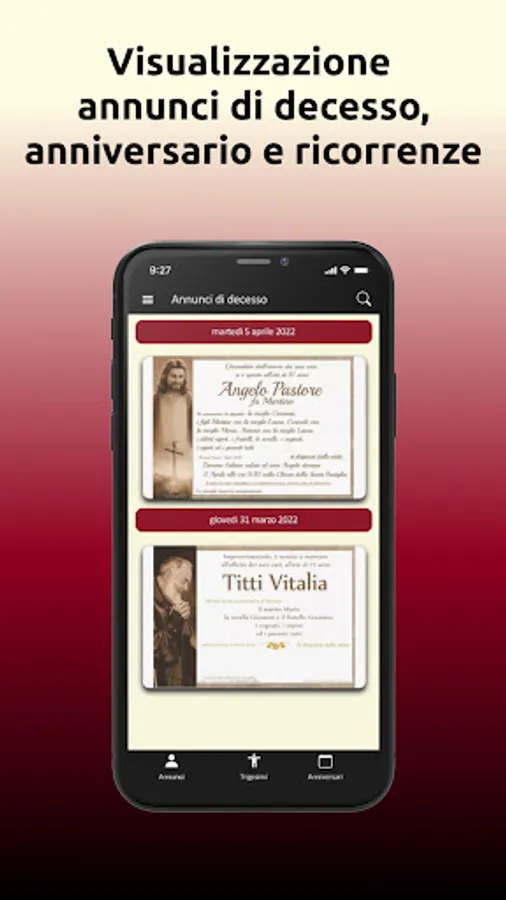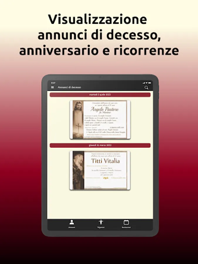 You will receive real-time notifications of those who died today and you will be able to know all the useful information regarding the death and the funeral, with a wide possibility of interaction with the families affected by the mourning and with our funeral agency Antonaci Onoranze Funebri, always at your disposal service also in the field of media and technological innovation!