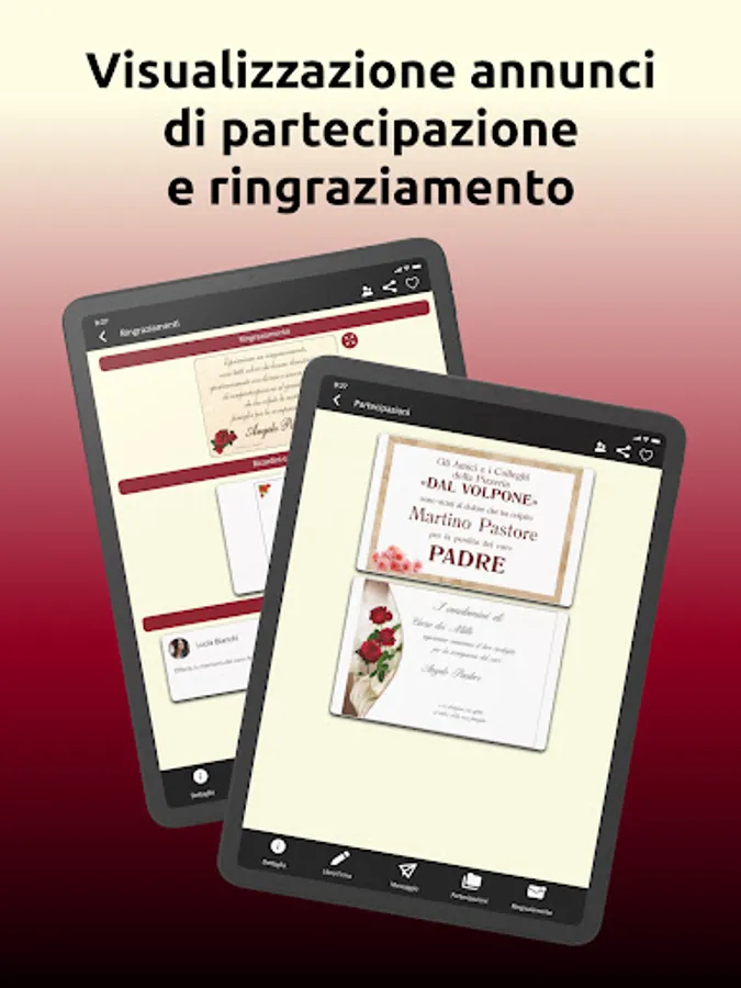 The Antonaci Onoranze Funebri mobile app is a valid technological resource for being close to and supporting the family of the deceased, contributing to the creation of a united virtual community, even if physically distant, in a human feeling of closeness and affection: thanks to our systems and with a simple click, it is possible to send messages of condolence to the relatives of the deceased, and receive cards and souvenirs of thanks of the missing person from all over the Universe!