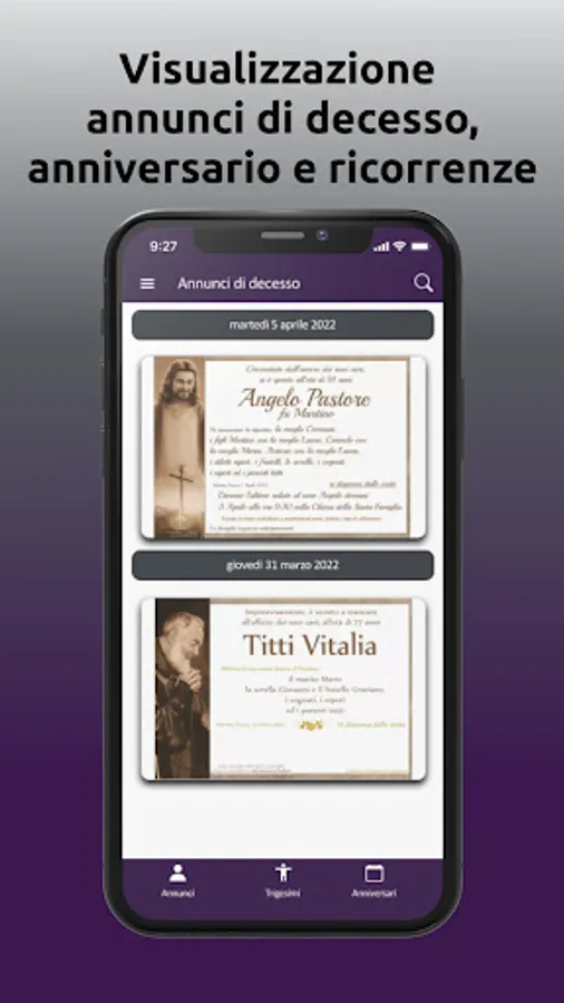 You will receive real-time notifications of those who died today and you will be able to know all the useful information regarding the death and the funeral, with a wide possibility of interaction with the families affected by the mourning and with our funeral agency Dalsasso Onoranze Funebri, always at your disposal service also in the field of media and technological innovation!