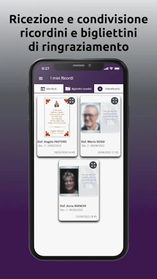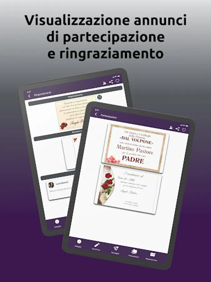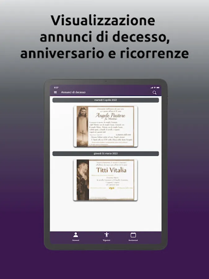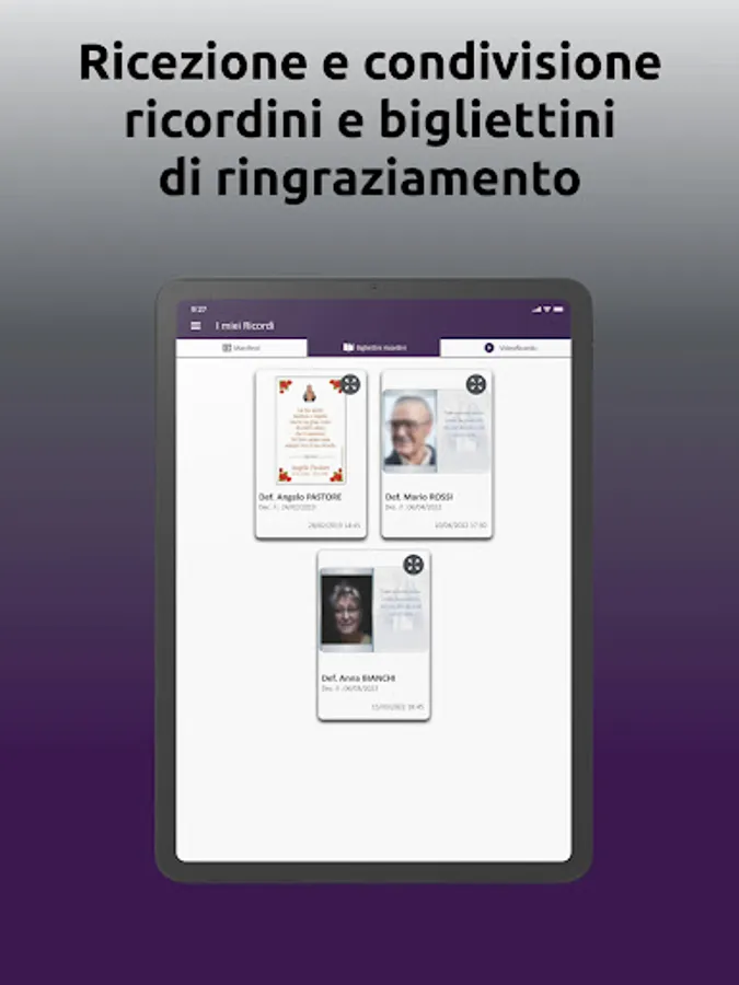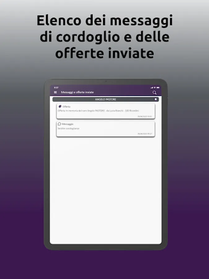 Our app is reliable and serious, it virtually accompanies you in the moment of mourning, offering you a wide range of services including a dedicated section where you can view all our partners and get in touch with them directly from your smartphone and Tablet!