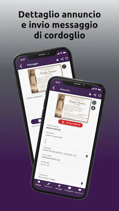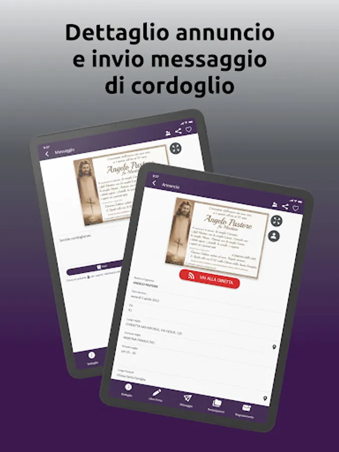 It is no longer necessary to consult the funeral posters posted on the streets, with our app it is quick and easy to view the geolocation on Google Maps of the place of the vigil, the funeral and the burial.