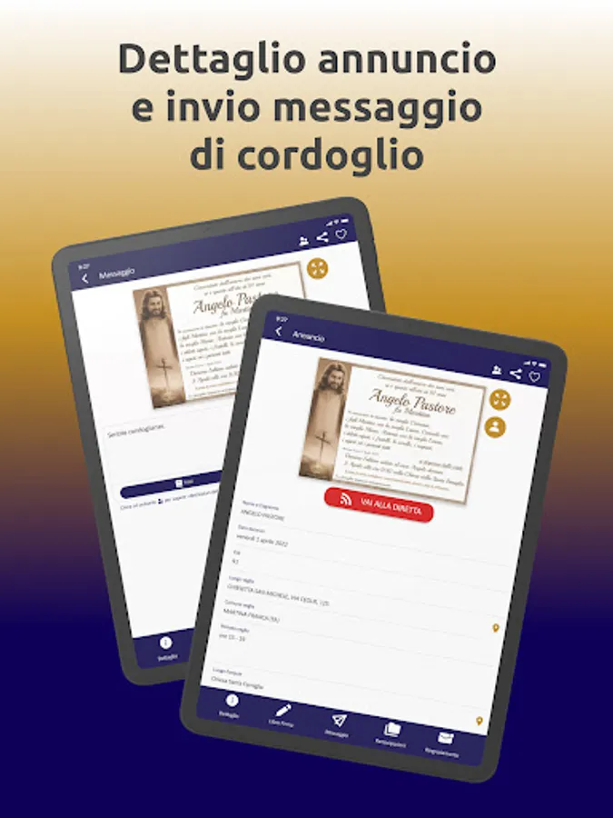 It is no longer necessary to consult the funeral posters posted on the streets, with our app it is quick and easy to view the geolocation on Google Maps of the place of the vigil, the funeral and the burial.