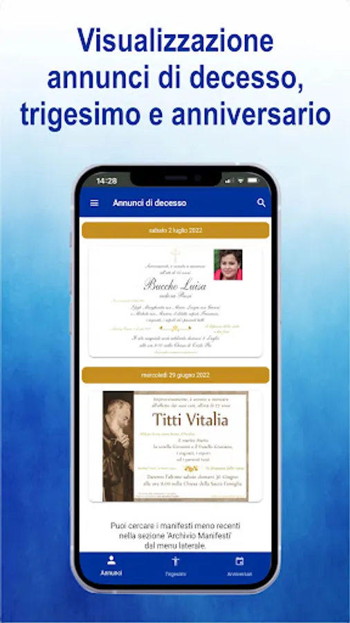 Free forever, the Castellana mobile app is always able to help you participate and interact, even if virtually, in the sad event of the loss of a loved one: consulting our large archive of funeral services, just a simple search by entering the name of the deceased or the date of death and you will instantly find all the news you are looking for!