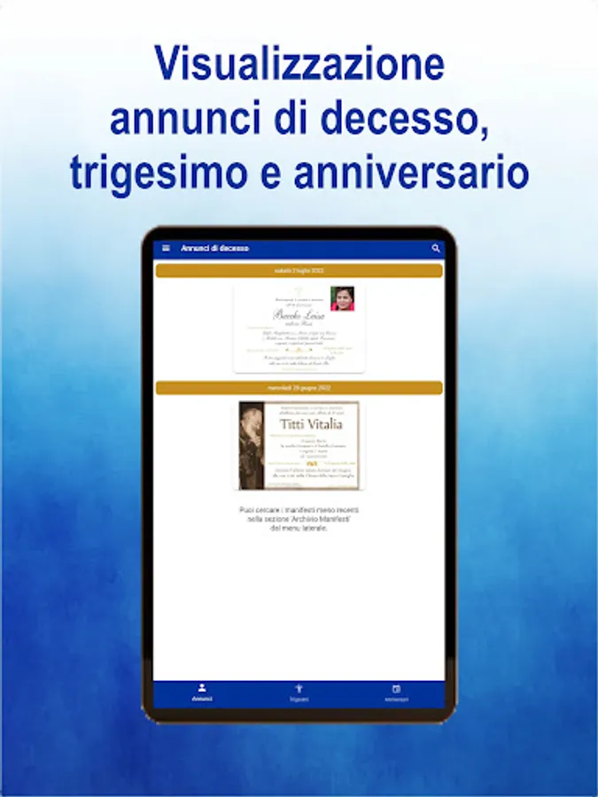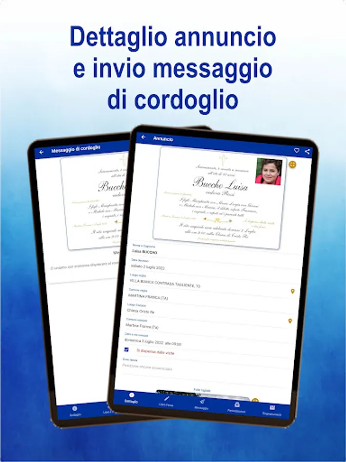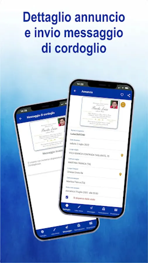 You will receive real-time notifications of those who have died today and you will be able to know all the useful information regarding the death and funeral, with a wide possibility of interaction with families affected by bereavement and with our funeral agency Castellana, always at your service too. in the field of media and technological innovation!