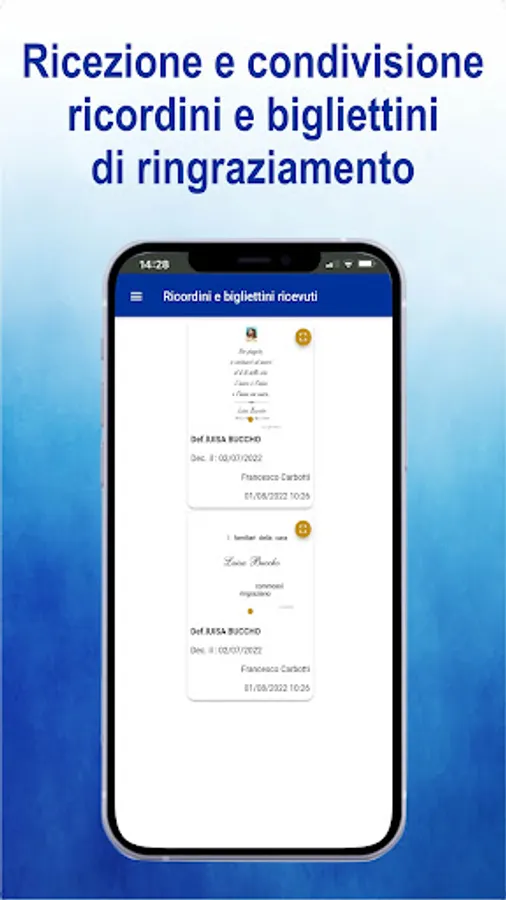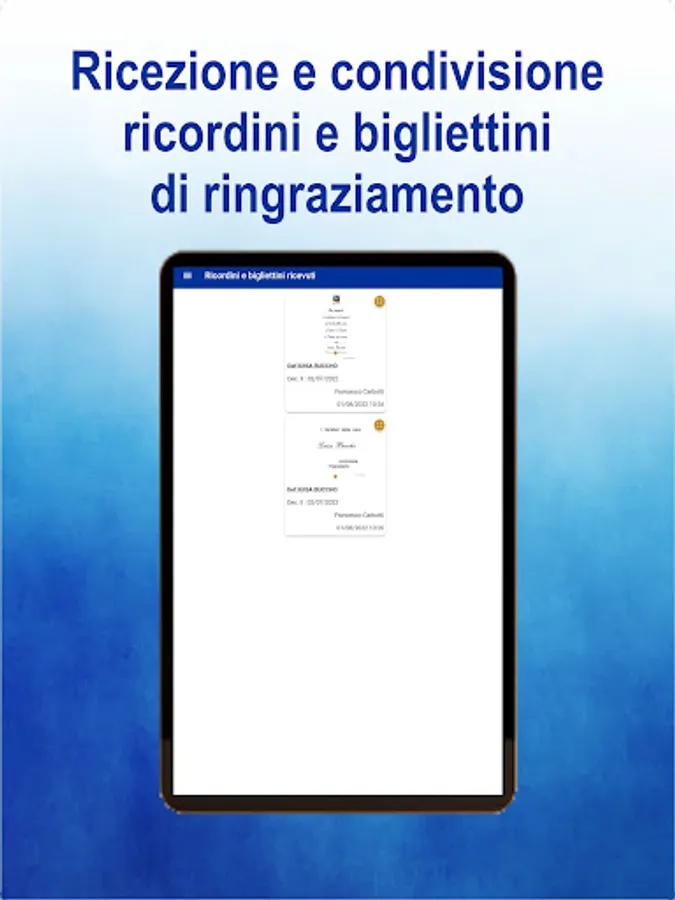 The Castellana mobile app is a valid technological resource for being close to and supporting the family of the deceased, contributing to the creation of a virtual community united, even if physically distant, in a human feeling of closeness and affection: thanks to our systems and a simple click, it is possible to send messages of condolence to the relatives of the deceased, and receive notes and souvenirs of thanks from the missing person from all over the Universe!