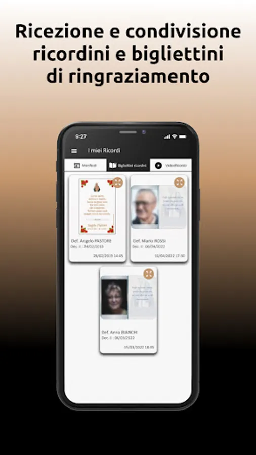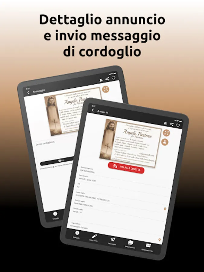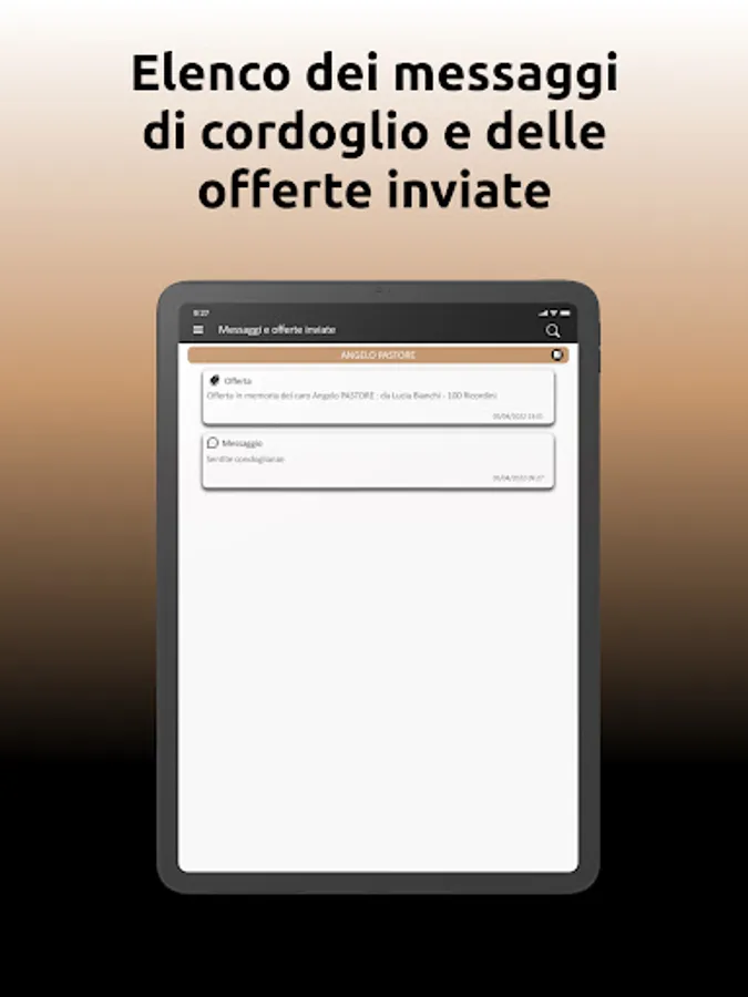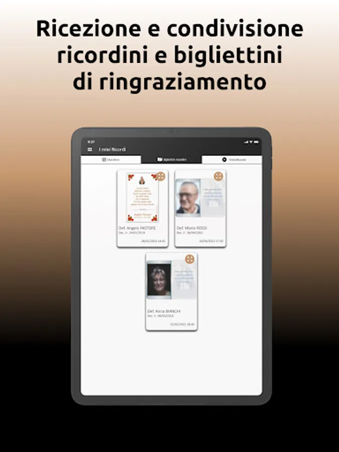 Our app is reliable and serious, it virtually accompanies you in the moment of mourning, offering you a wide range of services including a dedicated section where you can view all our partners and get in touch with them directly from your smartphone and Tablet!