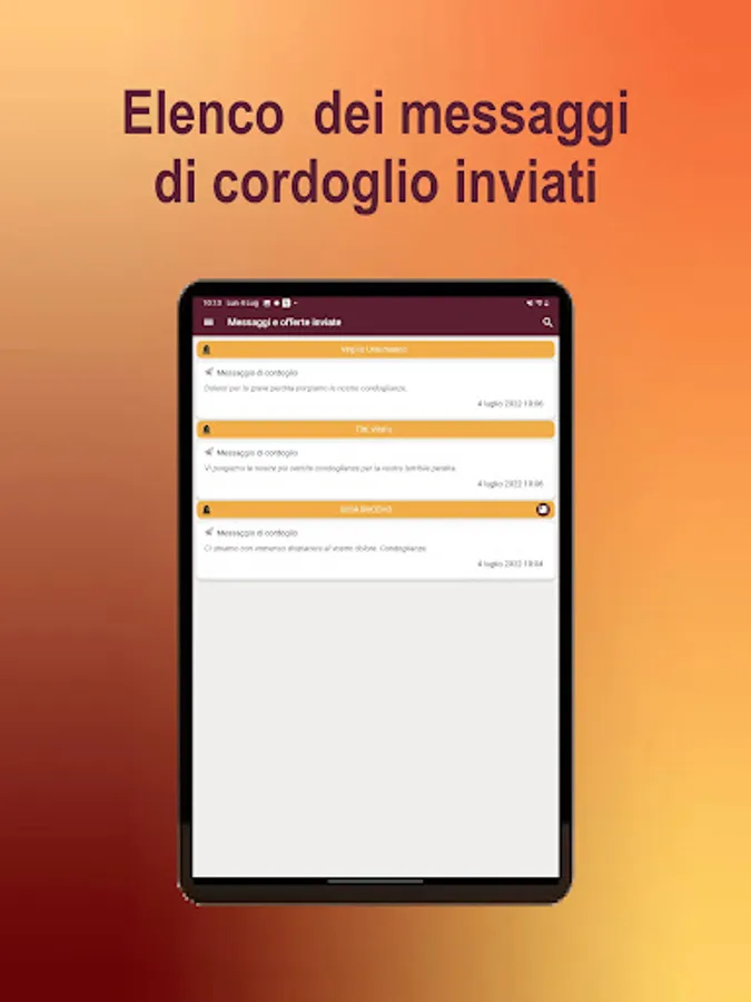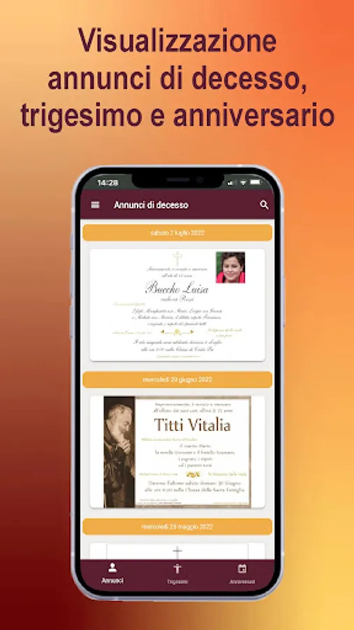 You will receive real-time notifications of those who have died today and you will be able to know all the useful information regarding the death and funeral, with a wide possibility of interaction with families affected by bereavement and with our funeral agency Onoranze Funebri Claudio Tilli, always in your service also in the field of media and technological innovation!