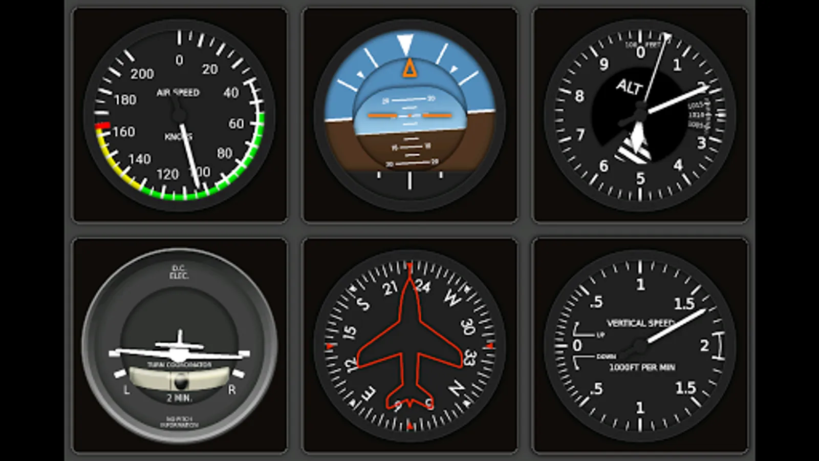 Airspeed, artificial horizon, altimeter, turn coordinator, gyro compass, and variometer.