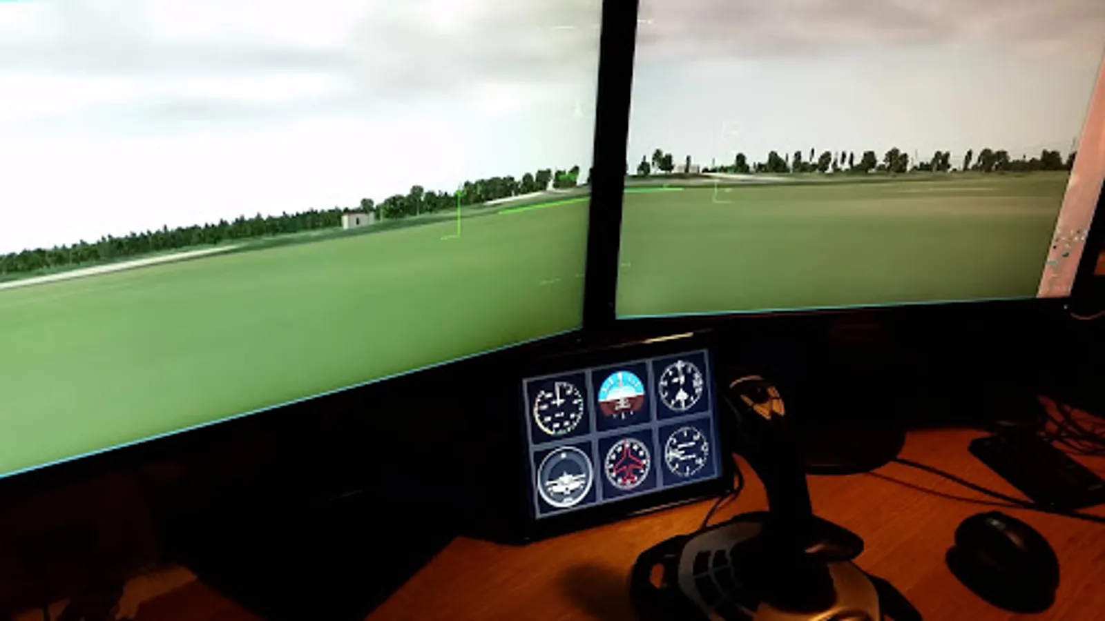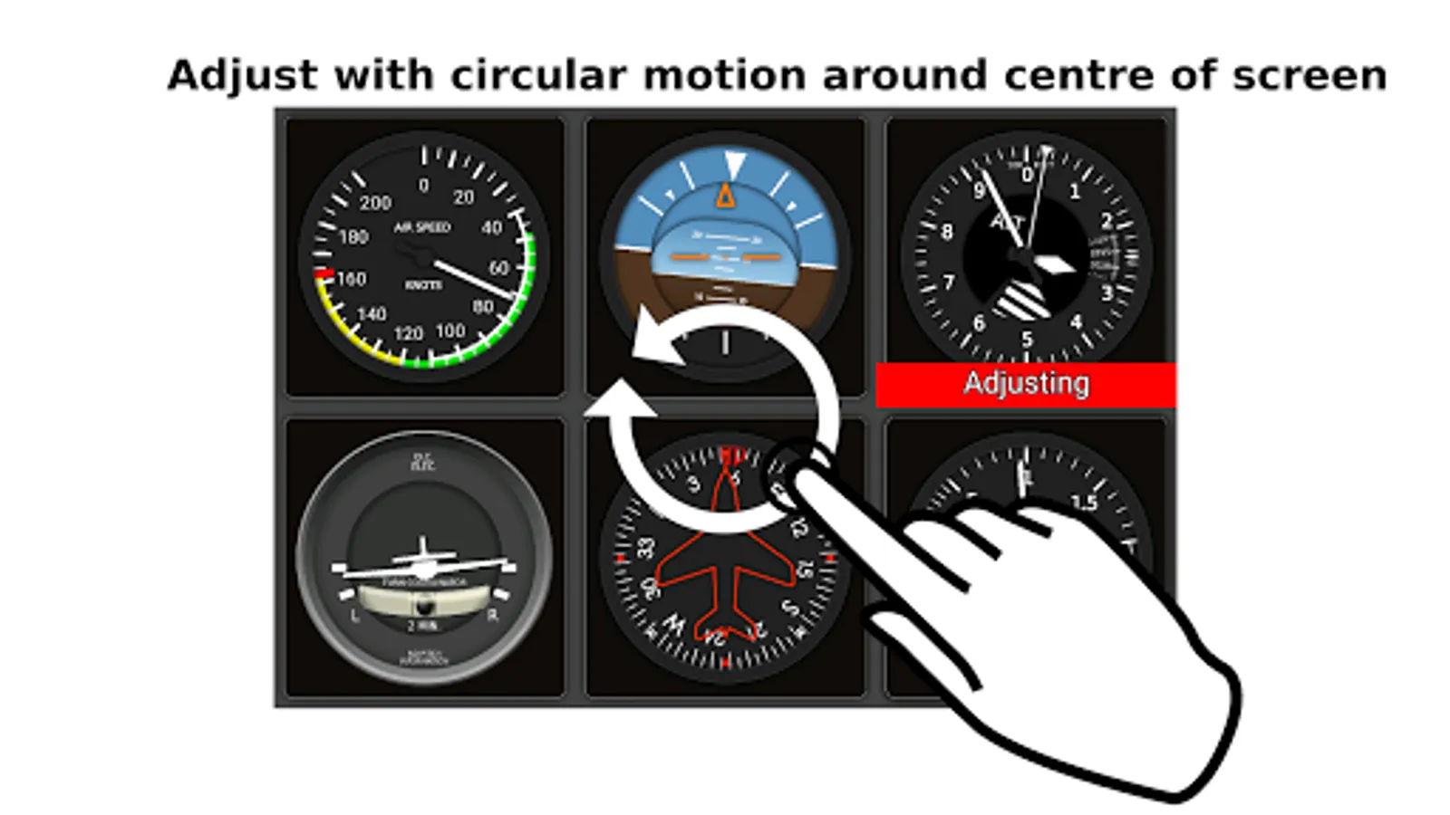The artificial horizon, altimeter, and heading bug are adjustable using the touchscreen.