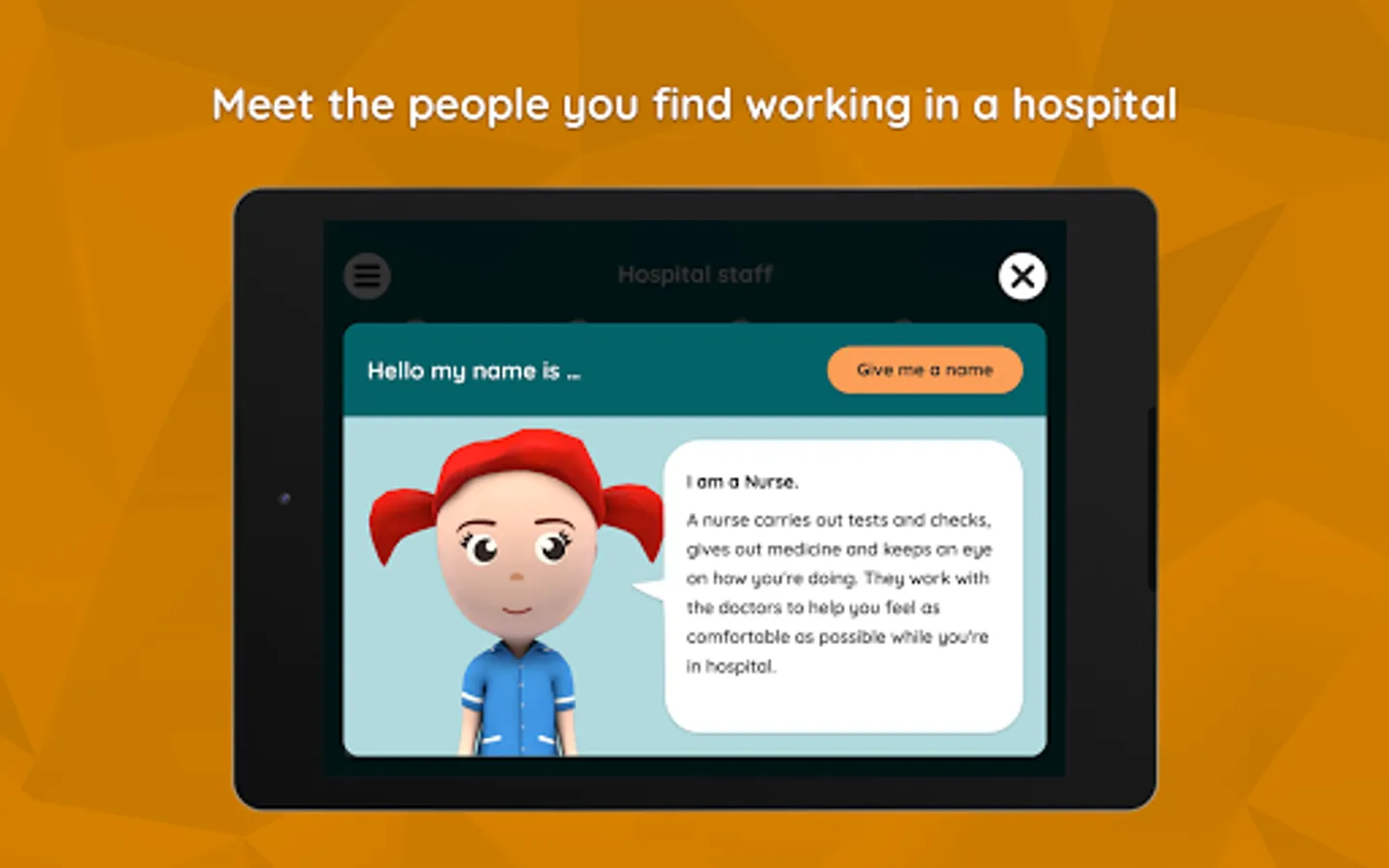 Your Guide will introduce you to avatars of all the different types of people that work at the hospital. You can change how they look and give them names so that they look like your own doctors and nurses.