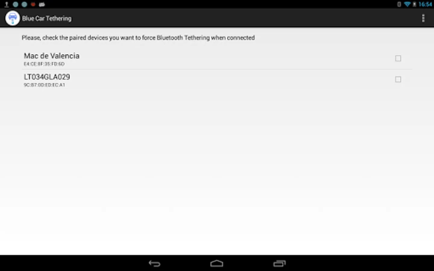 This app can be used for activating bluetooth tethering with any other devices, not just cars, including tablets and other mobile phones, just use it if you need to activate bluetooth tethering everytime you want to use it.
