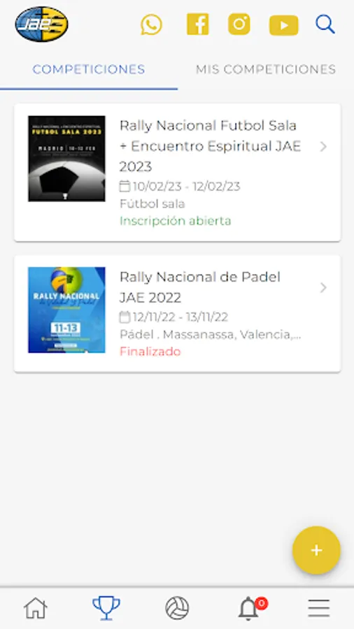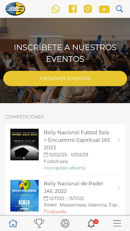 Follow the events, camps and spiritual meetings of the National Department of Young Adventists in Spain. Receive all the details of the upcoming spiritual meetings and events, about their schedules, registrations and details. Consult the information of the tournaments such as: schedules, results, classifications, statistics in real time. Receive notifications from the organizer and reminders of your matches.