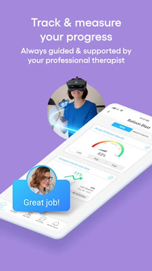 The mobile app helps you track your progress and results, and to follow your digital training plan. The app includes CliniChat, an easy and secure messaging feature for you to stay connected to your XRHealth therapist during your treatment plan.