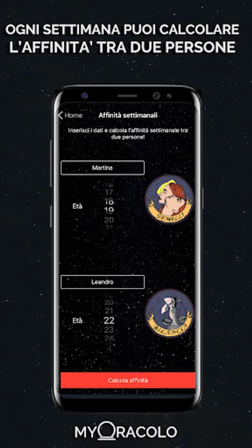* Weekly affinities: every week you will have the opportunity to calculate the percentage of affinity between two people. The affinity is based only on the current week and is updated every Monday at 00:01.