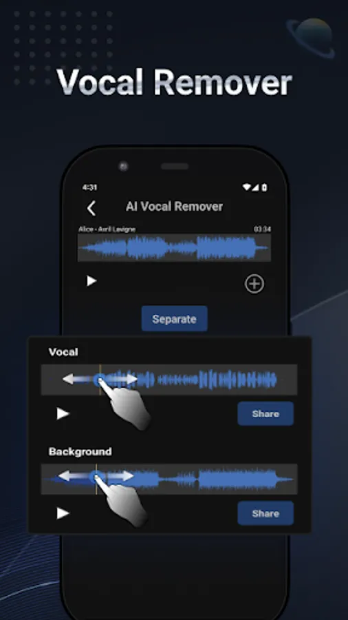 • AI powered vocal remover & vocal extractor: extract instruments and vocals from any audio file.