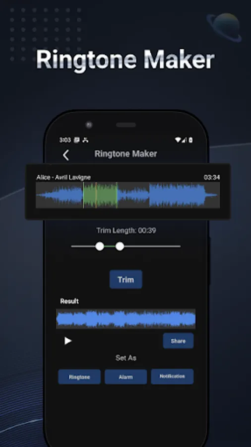 • Ringtone Maker & Audio Trimmer: cut any part from a music file and set it as a system ringtone, alarm tone or message notification tone, or directly share the clip file.