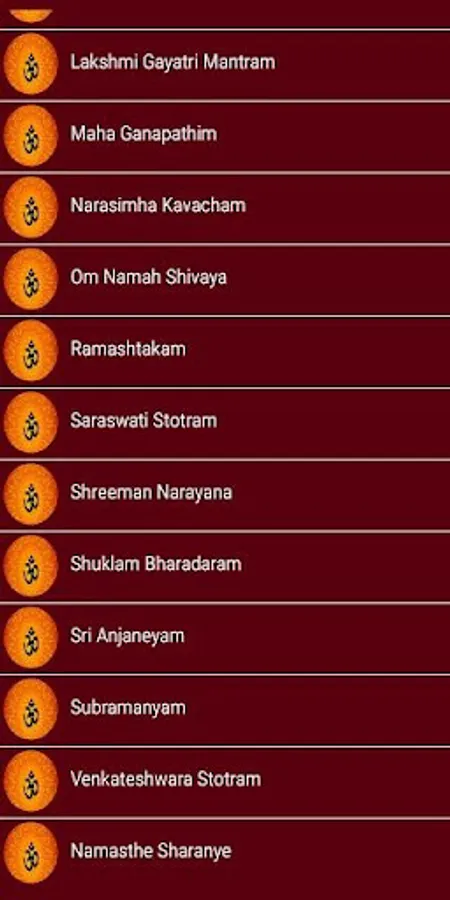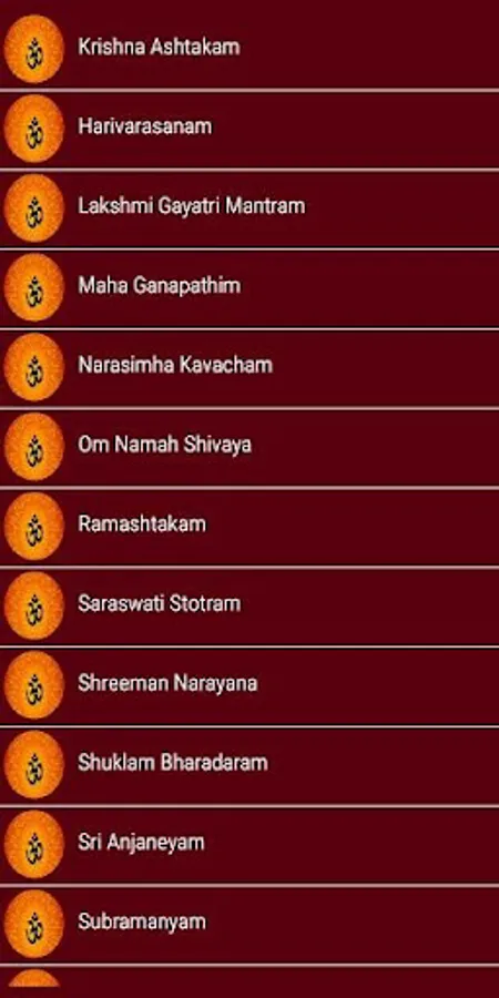Krishna Ashtakam,Harivarasanam,Lakshmi Gayatri Mantram,Maha Ganapathim,Narasimha Kavacham,Om Namah Shivaya,Ramashtakam,Saraswati Stotram,Shreeman Narayana,Shuklam Bharadaram,Sri Anjaneyam,Subramanyam,Venkateshwara Stotram,Namasthe Sharanye, These are the songs that you can see in this application for all gods.