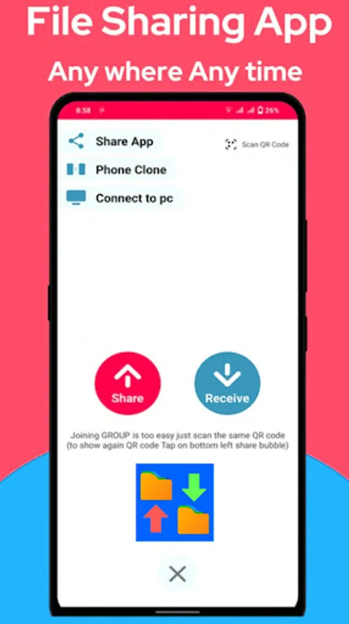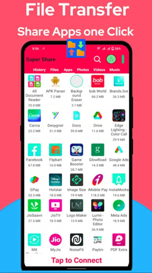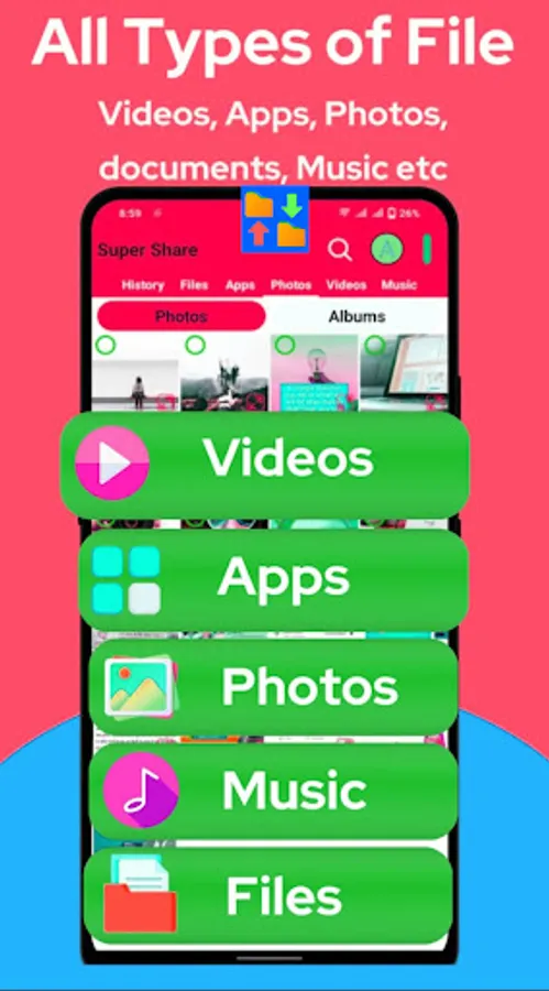 Xender file transfer Sharing photos, music, videos, apps, documents and any other file types of Unlimited file Size.