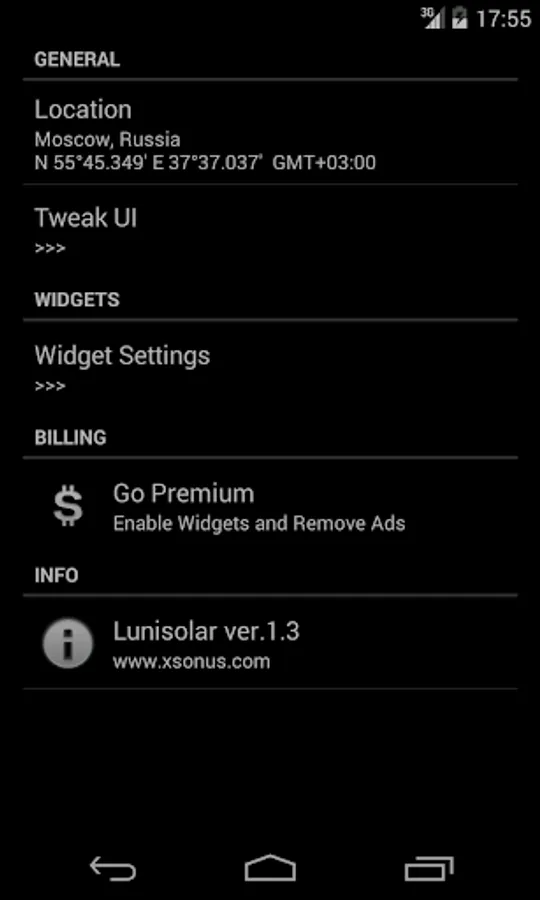 Premium users get a couple of nice customisable widgets (1x1 Sun widget and 1x1 Moon widget), some additional features and no advertisements.