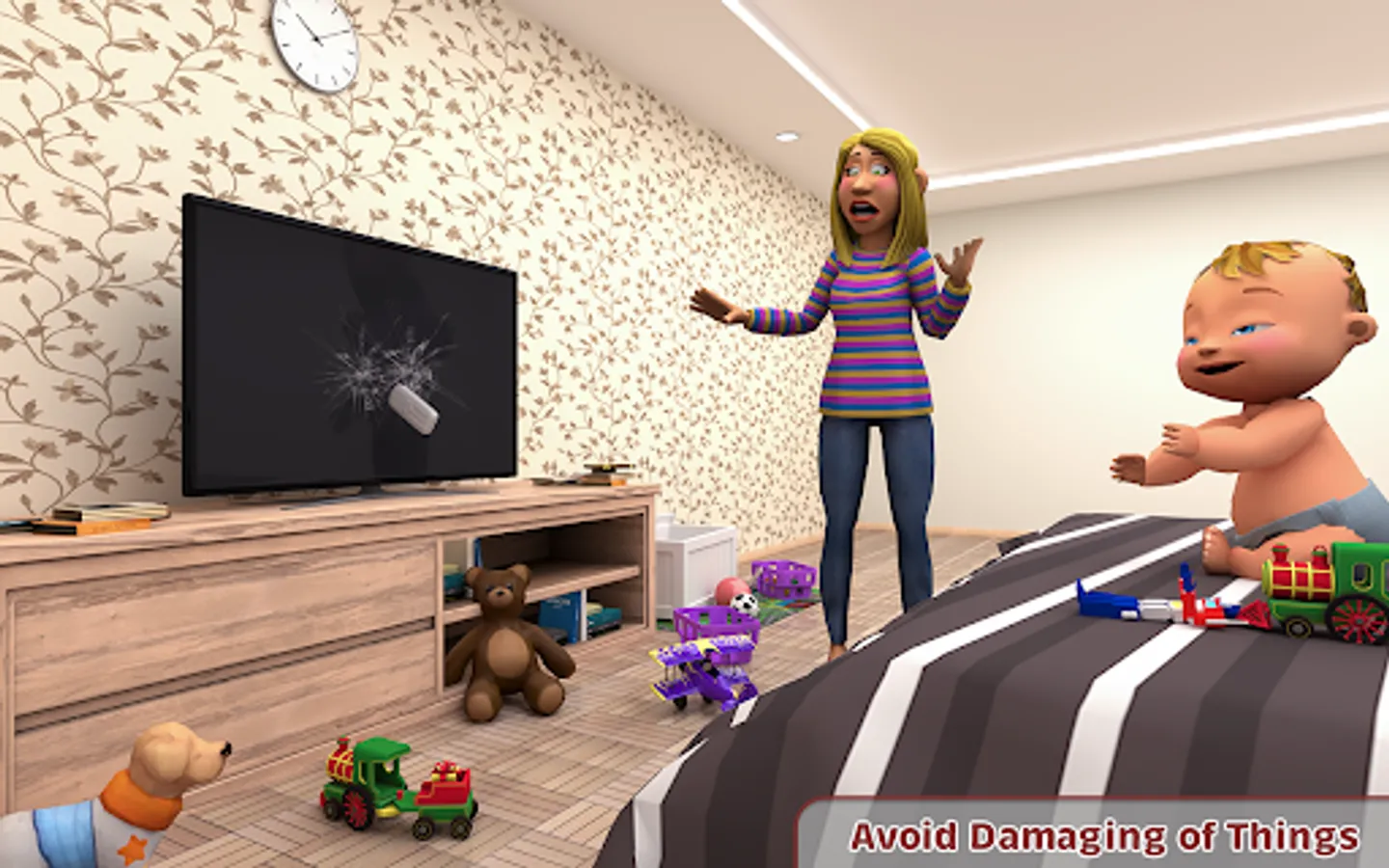 Prank in baby simulator family games with mom. You can damage the oven while cooking food by increasing the temperature in these family games. Baby in this family simulator is throwing the football in real life to break the TV. Family games have good news for you. You can play this mother simulator as a virtual baby.