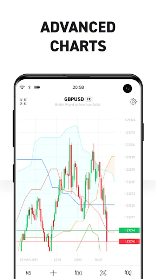 View different charts types, 10+ indicators, technical analysis and drawing tools