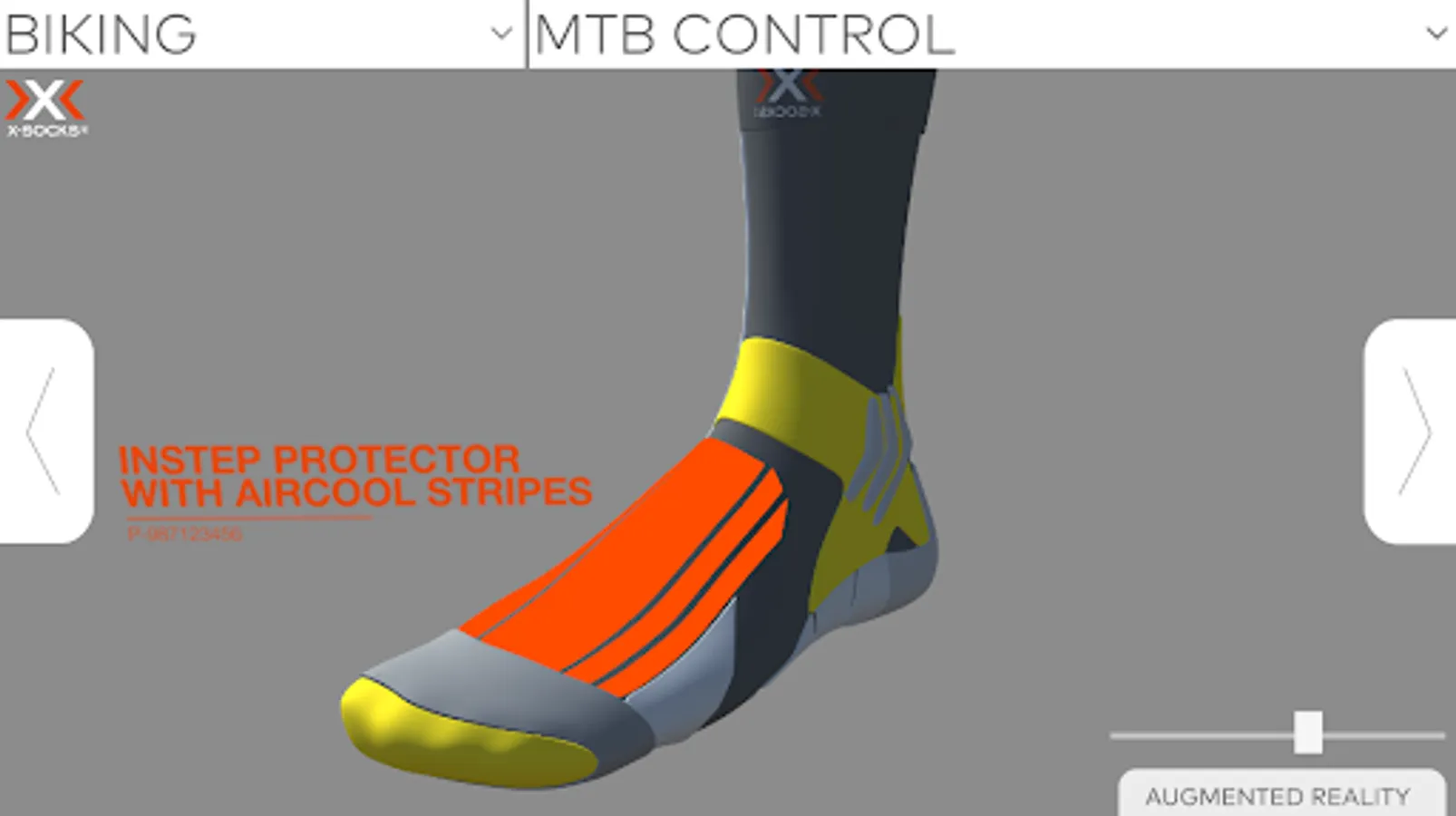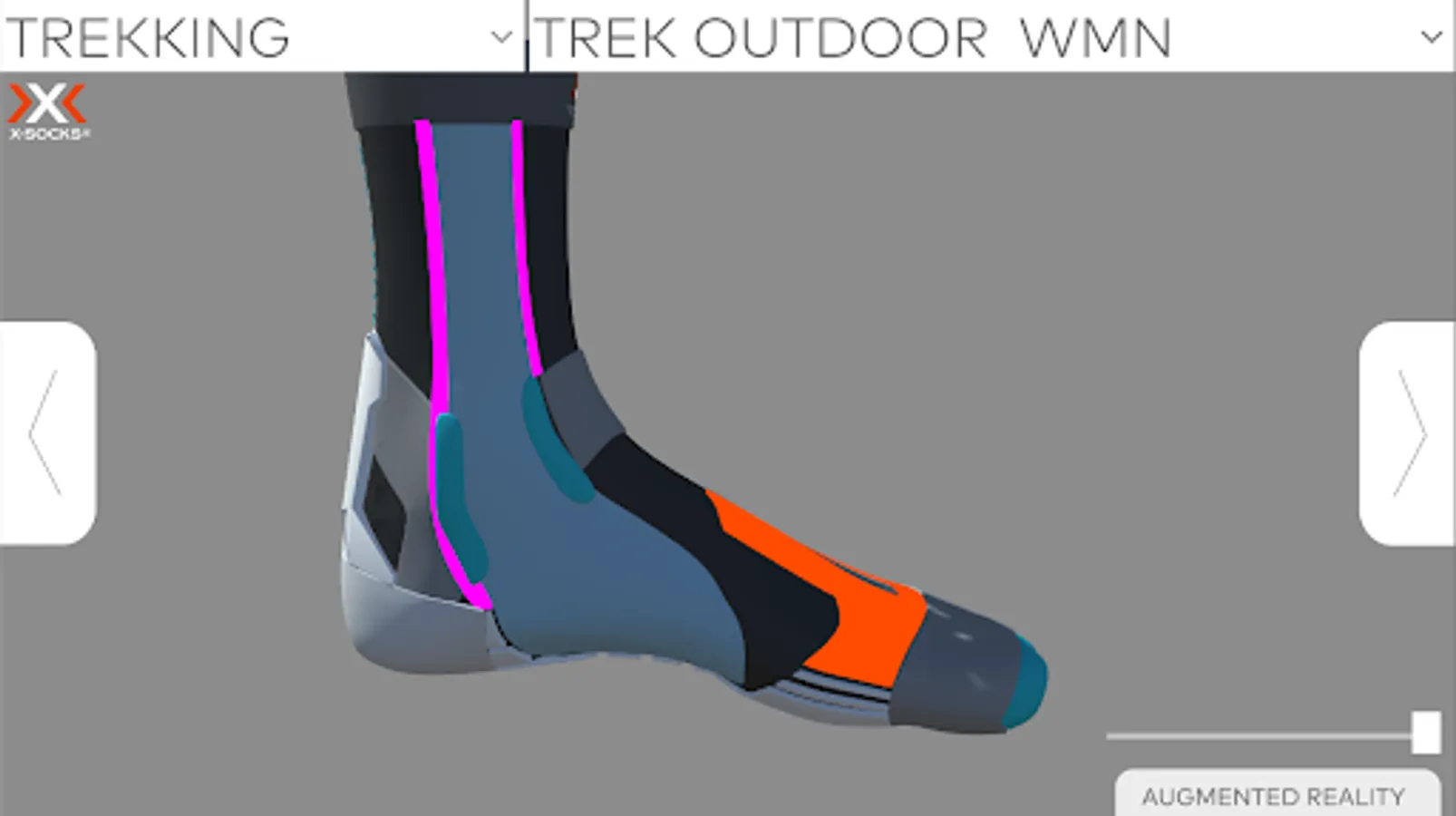 Die X-Socks App stellt die Sportsocken von der Schweizer Sportfirma X-Socks® in 360° da. Zusammen mit der daugehörigen Matte kann man sich die Socken per Handy oder Tablet in «Augmented Reality» in einem Raum anschauen. Die verschiedenen Technologien, die in die Socken von X-Socks® eingearbeitet sind, werden in verschiedenen Farben angezeigt, welche für den User anklickbar sind. Nach dem anklicken erfährt der User mehr über die Technologie und welchen nutzen diese hat. Die verschiedenen Technologien, die in der App angezeigt werden, haben eine direkte Auswirkung auf die Füsse des Sportlers.