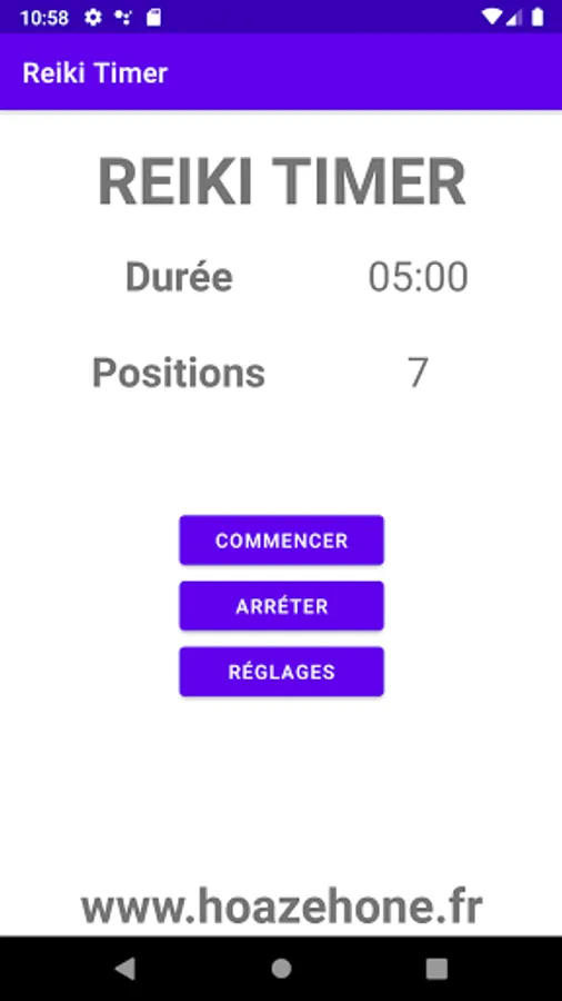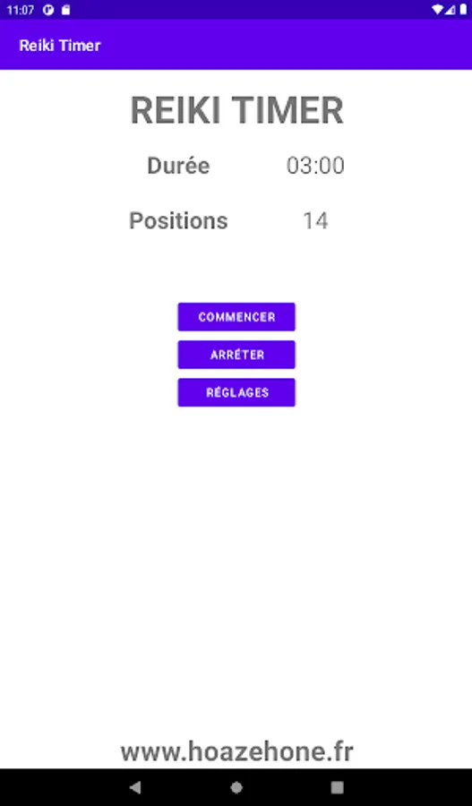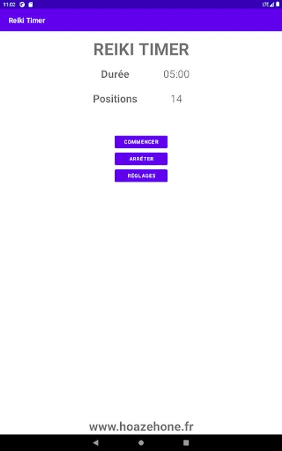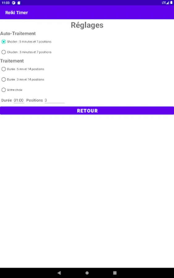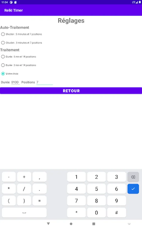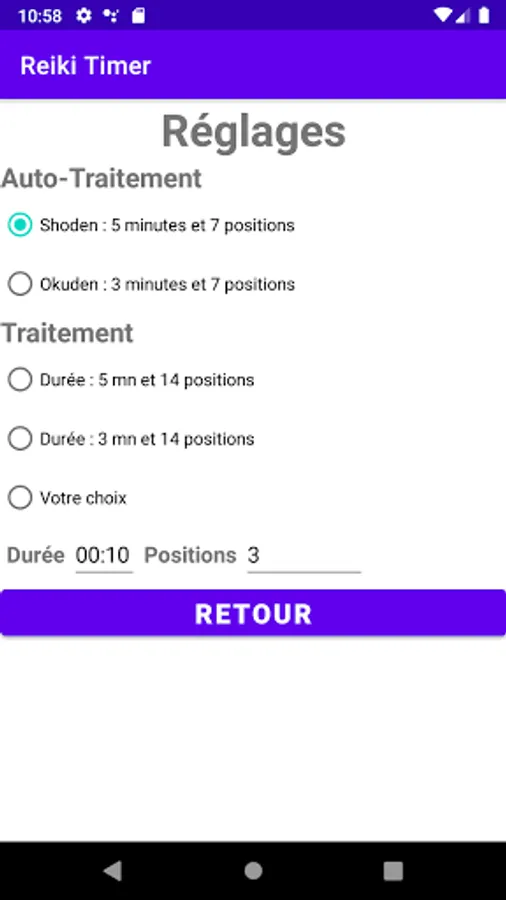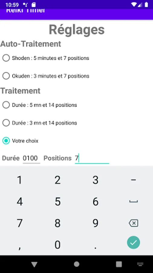 The adjustment page allows you to choose the treatment time and the number of standard positions according to your degree of progress in the practice of Reiki: For first grade people, the affixing time is 5 minutes, and it There are 7 positions in self-treatment and 14 for a given treatment.