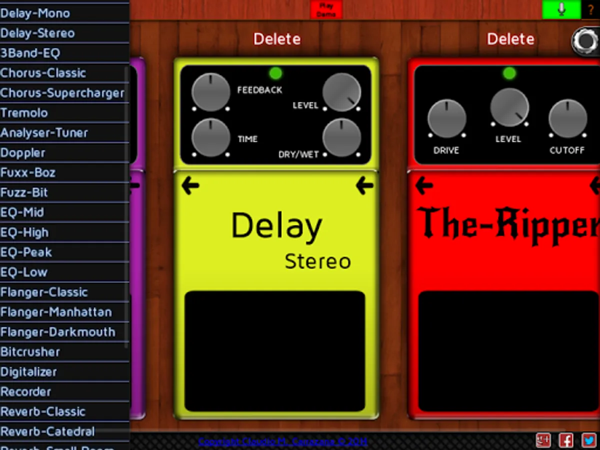Effects availables: Digitalizer, Bitcrusher, Flanger-Darkmouth, Flanger-Manhattan, Flanger-Classic, EQ-Low, EQ-Mid, EQ-High, EQ-Peak, Fuxx-Boz, Fuxx-Bit, AutoReverb, Fuzz, Overdrive, Overscream, Chorus-cassic, Chorus-supercharger, Delay-mono, Delay-Stereo, 3-BandEQ, Reverb-classic, Reverb-catedral, Reverb-smallroom, Rinring, Convolver, Compressor, Limiter, The-Ripper, The-Bytter, Flanger-Silver, Flanger-Stereo & Sterefy.