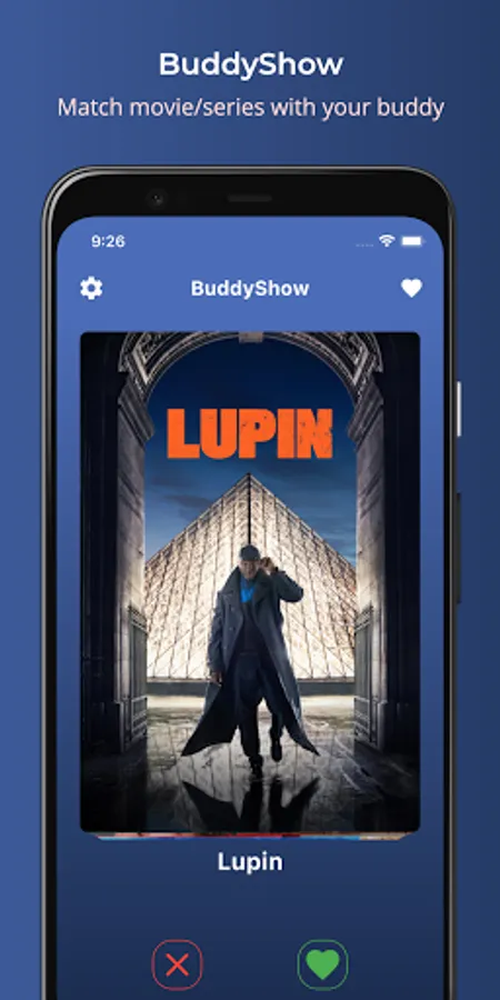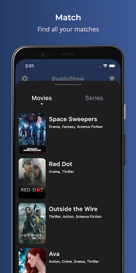 Swipe right or left each movie or series you want to see or not. If your buddy also liked the movie/series you will be able to find it in the list of matches.