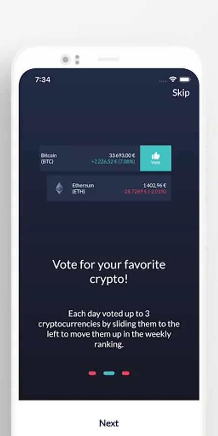 Each day you have 3 votes to move your favorite crypto-currencies up in the ranking of the week. Just slide your cryptocurrency on the left and press "vote".