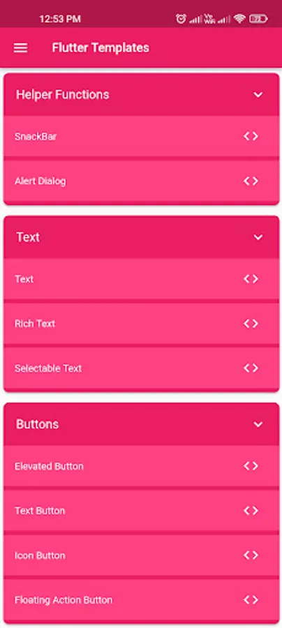 This app provides built in templates for in-build UI widgets in flutter and many more things including: