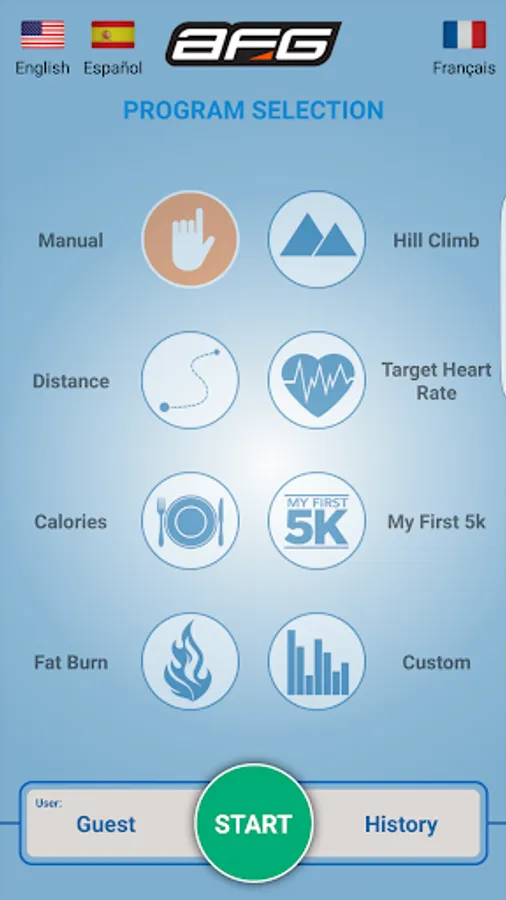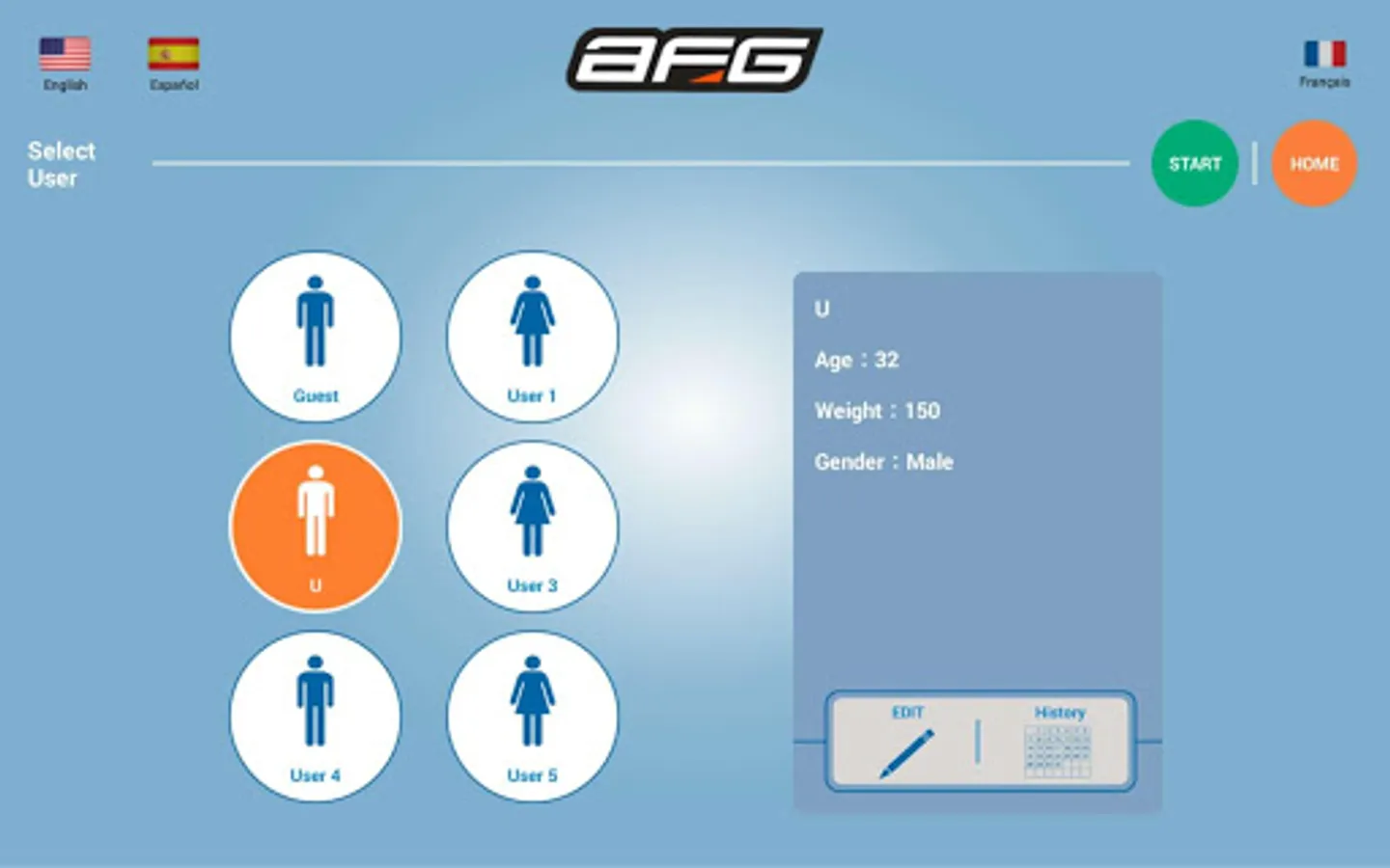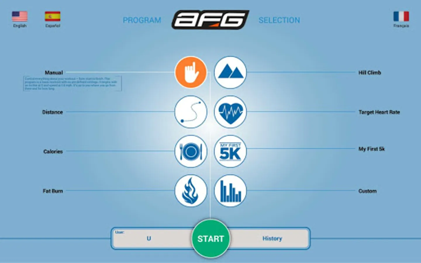 The AFG Pro Fitness app allows you to connect your AFG Pro 7-series and AFG 6-series treadmill, elliptical and incline trainer to your tablet or phone and gives you total control of your fitness experience. Use the AFG Pro app and your tablet or phone to wirelessly control your machine, monitor your workout and manage your fitness goals. Designed with customizable data displays, large navigation buttons and intuitive interactive features, the AFG Pro app provides the perfect combination of an easy-to-use console interface and a fitness tracking app. Plus, the AFG Pro app easily syncs to the #1 nutrition app MyFitnessPal and the popular fitness app MapMyFitness so you can quickly see your calories burned, distance logged and other performance data right within your favorite fitness app.