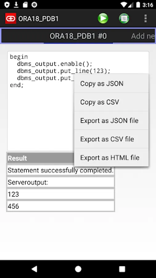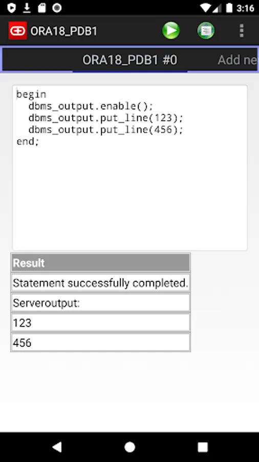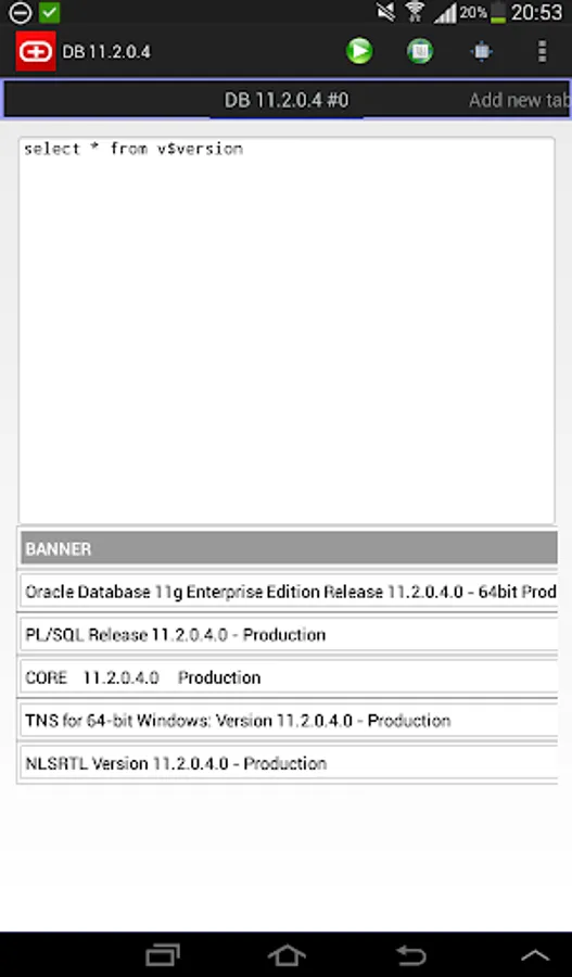 Simple Android Oracle client is a simple app that allows you to execute SQL queries, DML and DDL commands.