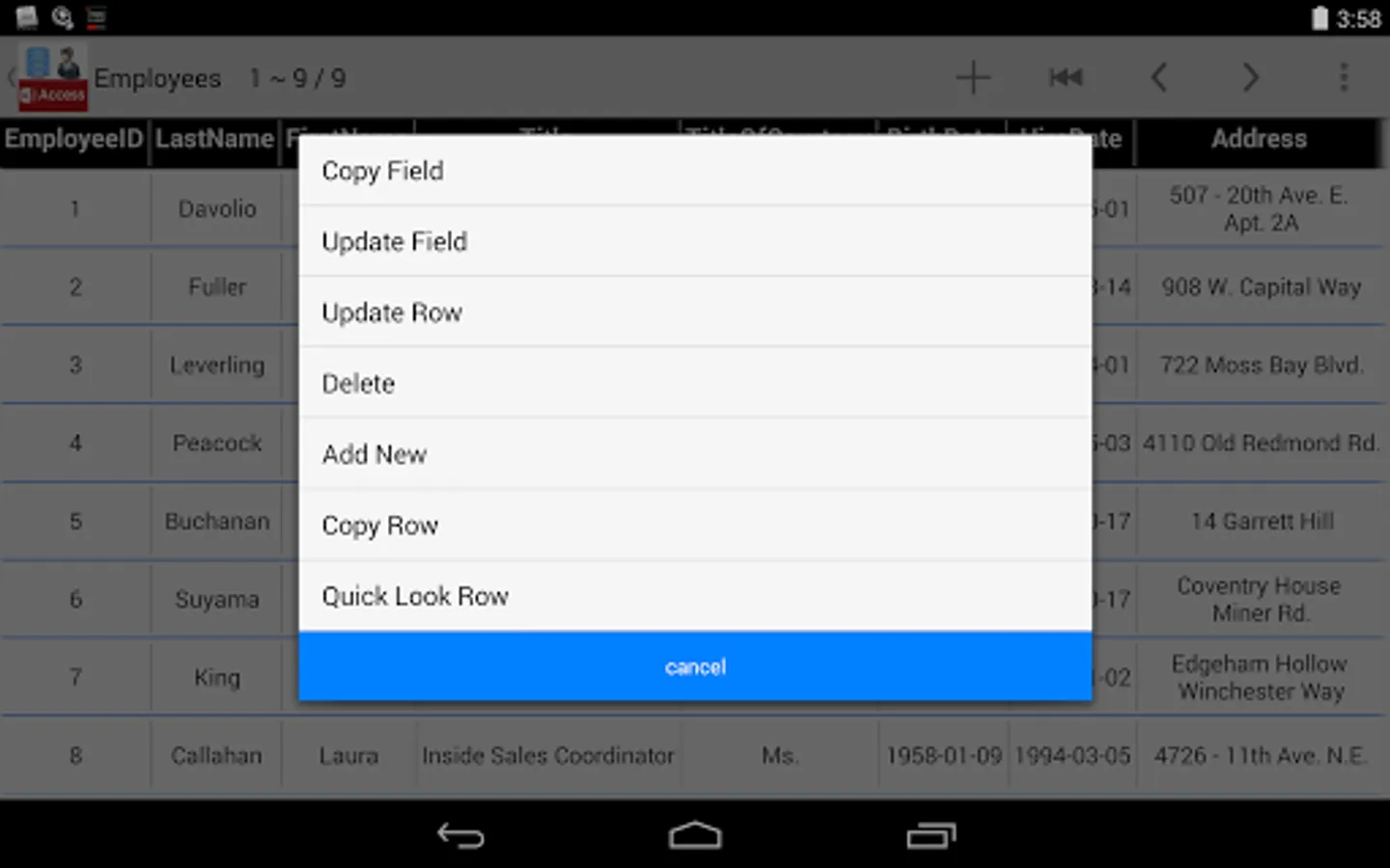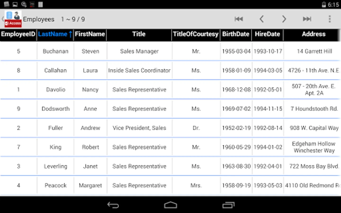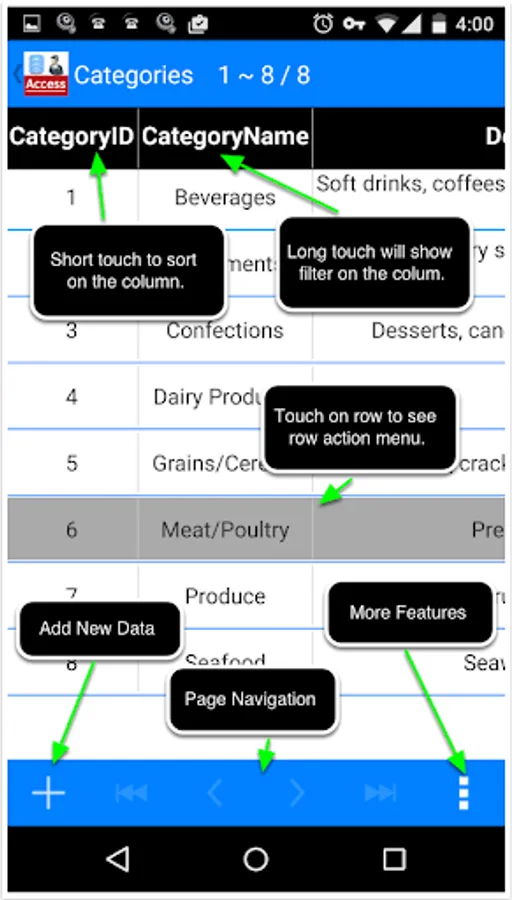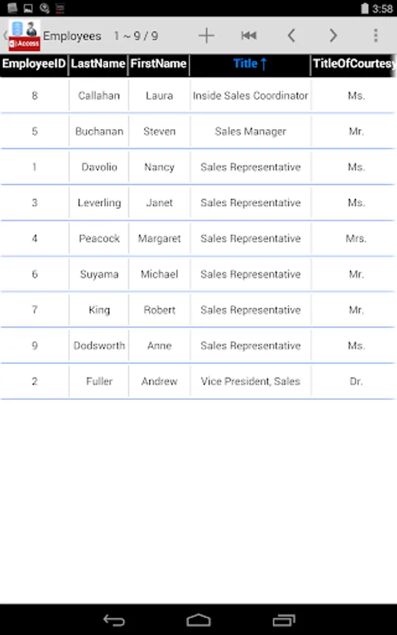 Open Microsoft Access database on your Android Device with Access Database Manager, you can view it easily with Zoom, Sort and Paging. You can even edit it directly on your phone or pad with in-app purchase feature 'Edit Data'.