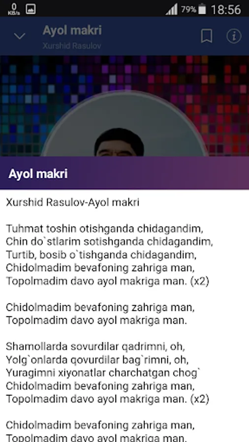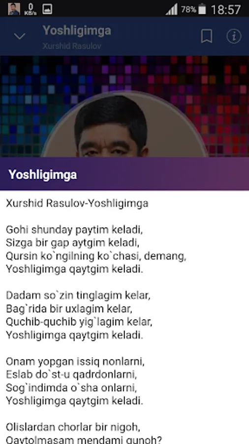Ko`p yillardan buyon qizg`in ijod qilib kelayotgan va ko`pchilikning ko`nglidan chuqur joy olgan, o`zing ma`nodor va o`lmas qo`shiqlari bilan dillardan chiqmas xonanda Xurshid Rasulov qo`shiqlari jamlangan mobil ilovani yuklab oling.