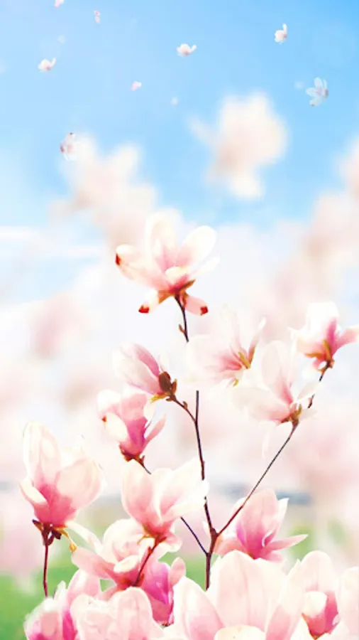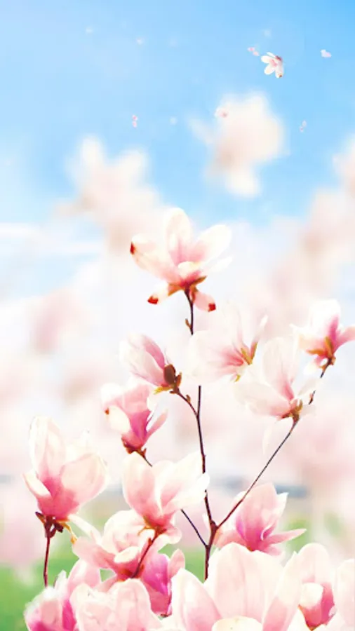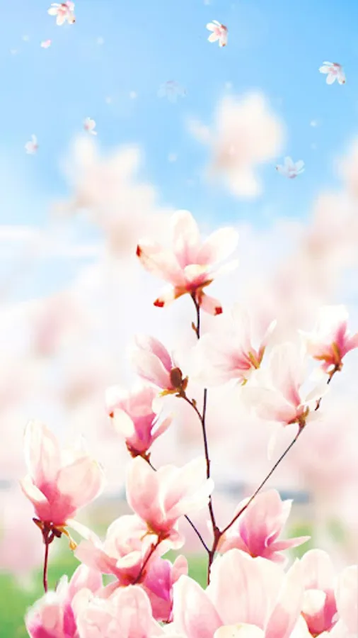 Magnolia Flower Live Wallpaper brings us a beautiful view of natural magnolia flowers in full bloom. With lovely white and pink flower petals, these fresh magnolia flowers show us again the charming of nature.And as the soft breeze stirs the flowers, there are so many beautiful flowers floating down from the light blue sky. So this fresh flower wallpaper will help decorate your phone screen beautifully and lovely in a natural way.