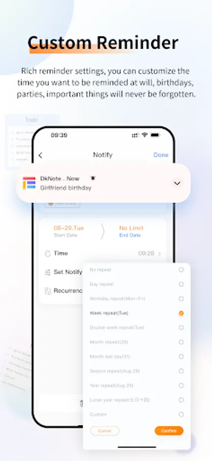 Rich reminder settings, you can customize the time you want to remind at will, birthdays, parties, important things will never be forgotten