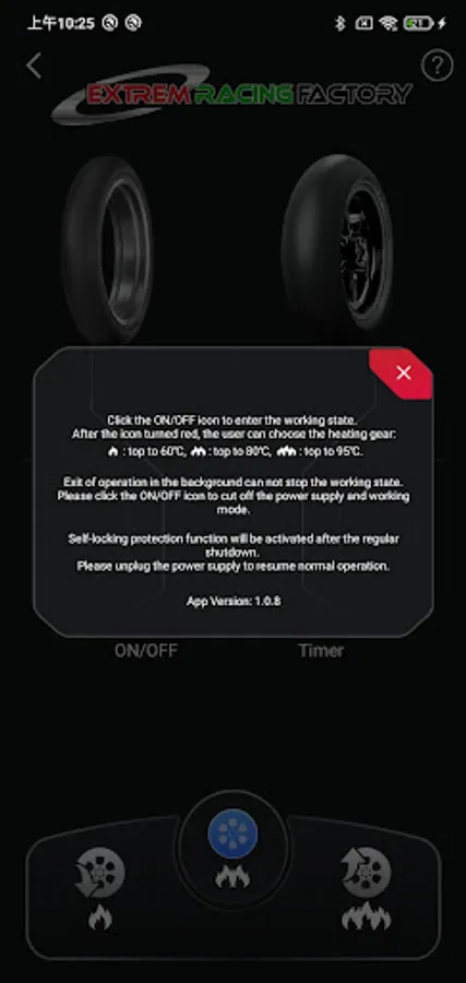 Connect the tyre warmer via Bluetooth to complete the heating, timing, disconnection and other functions of tyre warmer.